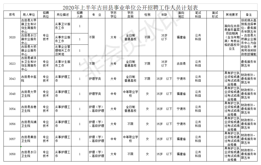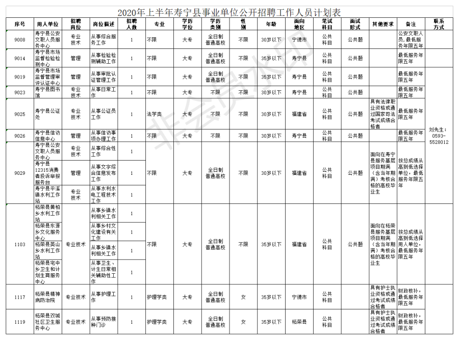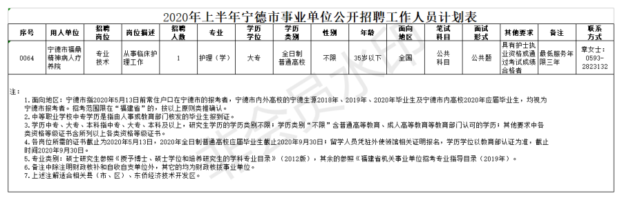 2.招聘条件:具有中华人民共和国国籍;遵守宪法和法律;具有良好的品行;适应岗位要求的身体条件;年龄在18周岁以上,40周岁以下(1980年5月13日至2002年5月13日期间出生),年龄为“30岁、35岁、40岁以下 ”的岗位,按此计算方法类推;面向地区“宁德市”指2020年5月13日前常住户口在宁德市的报考者,宁德市内外高校的宁德生源2018年、2019年、2020年毕业生及宁德市内高校2020年应届毕业生,面向地区为“县(区)” “福建省”,按以上原则类推确认。