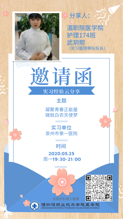 医学院18级学子即将进入临床实习,为帮助同学们深入了解实习生活,解决实习困惑,我院于5月25日通过企业微信直播平台,线上组织第二期实习经验分享交流会。本期我们邀请到泉州市第一医院实习队队长武玥熙同学为大家分享实习经历与心得体会。
