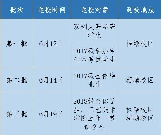 备注:1.2019级全体学生暂不返校;2.各批次学生严格按照时间安排返校,不得提前返校。