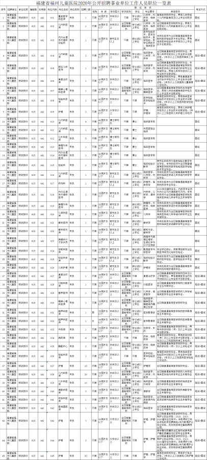 本次招聘职位为福建省福州儿童医院工作人员,共计划招聘144名,招聘职位、招聘人数、职位资格条件等详见附件《2020年福建省福州儿童医院公开招聘工作人员岗位信息表》(下简称《岗位信息表》)。