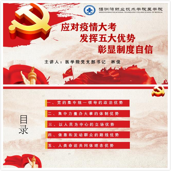 制度优势是一个国家的最大优势,制度稳则国家稳。习近平总书记指出,全国疫情防控阻击战取得重大战略成果,彰显了中国共产党领导和我国社会主义制度的显著政治优势。为强化党员干部的理想信念教育,激发党员责任与担当意识,2020年7月5日,医学院党支部林俊书记在图书馆二层学习大厅为全体师生党员同志上了一场“应对疫情大考 发挥五大优势 彰显制度自信”的主题党课。