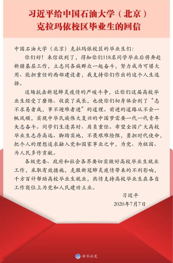 近日,习近平总书记给中国石油大学(北京)克拉玛依校区毕业生回信,肯定他们到边疆基层工作的选择,对广大高校毕业生提出殷切期望。一场抗击新冠肺炎疫情严峻的斗争,让本届高校毕业生经受了前所未有的磨练。在疫情之下,我们通过勤奋自律完成学业、努力把握机会,通过线上线下应聘实现就业。作为一名2020届毕业生,我们应该志存高远、脚踏实地,不畏艰难险阻,勇担时代使命,把个人的理想追求融入党和国家事业之中,为党、为祖国、为人民多作贡献!