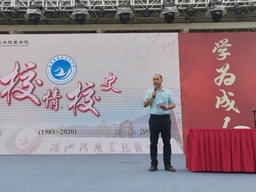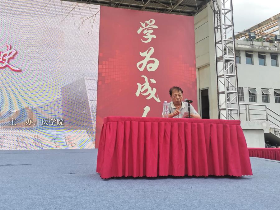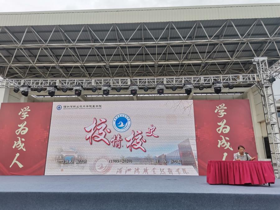 为了加强新生对学院发展历程、办学理念以及学院基本概况的了解,加深同学们对校园文化的理解,更好的秉承“学为成人”的校训精神,帮助新生更好地适应与熟悉校园环境,融入学校大家庭。10月19日上午,医学院邀请到关工委顾问、原湄洲湾工业学校党支部书记陈清洪老师在400米操场为2020级新生作校情校史教育讲座,讲座由医学院党支部书记林俊主持。