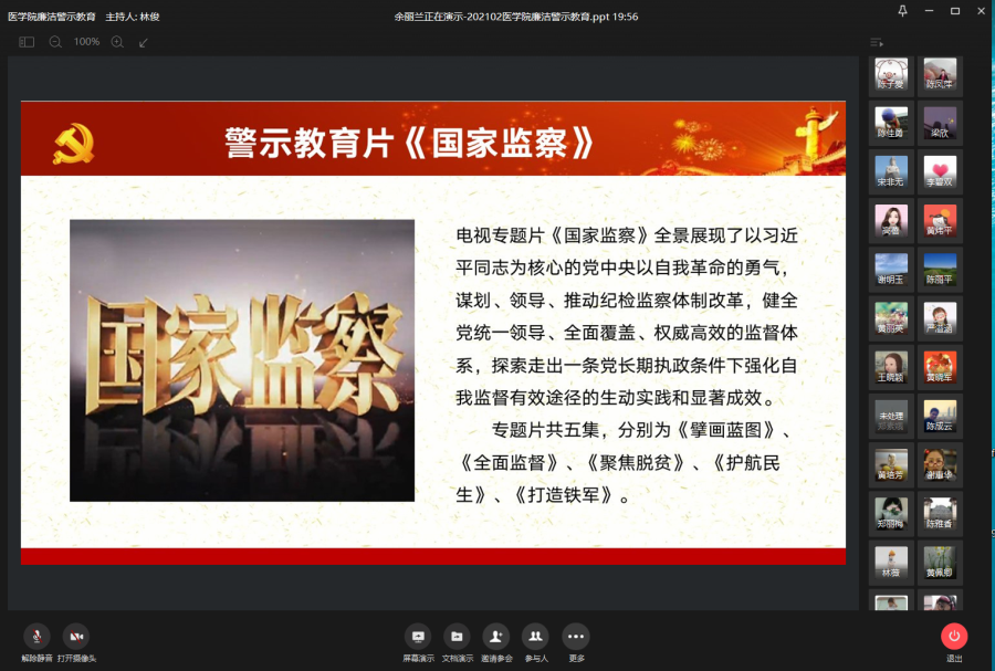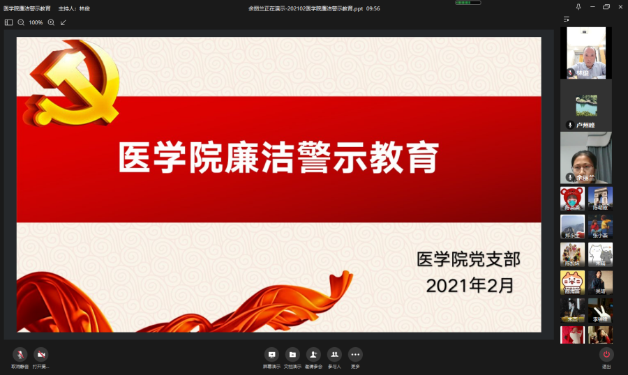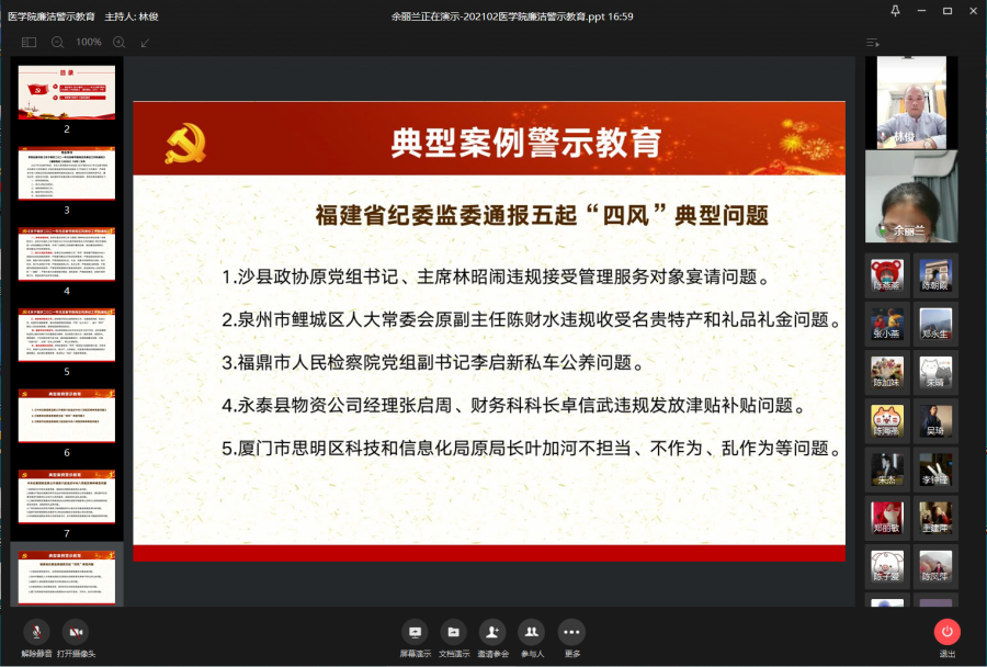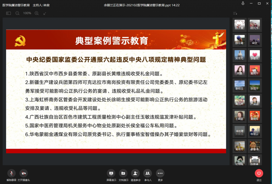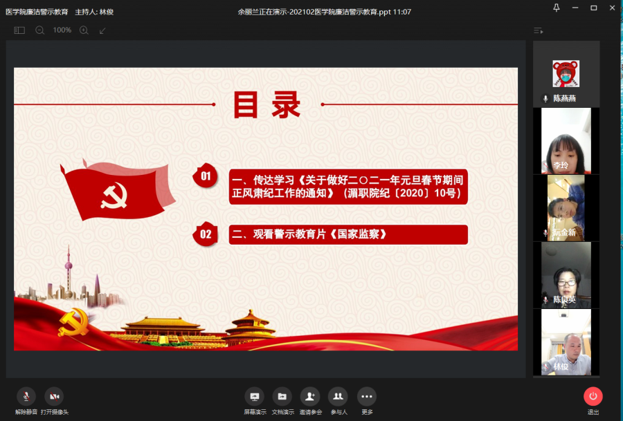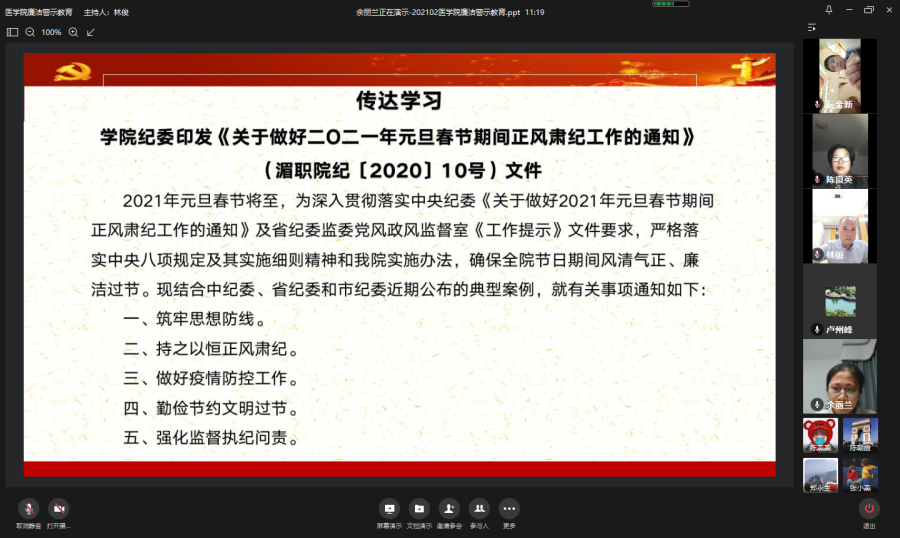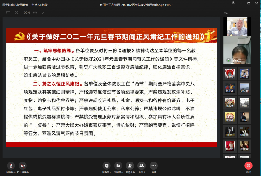 春节将至,为加强廉洁教育,强化廉洁自律意识,营造风清气正的节日氛围,巩固落实中央八项规定精神。医学院结合实际认真安排部署,于2月3日至5日采取线上集中学习文件精神和线下自主观看廉洁警示教育片的方式,组织全体教职员工开展廉洁警示教育活动,实现学习教育范围全覆盖。