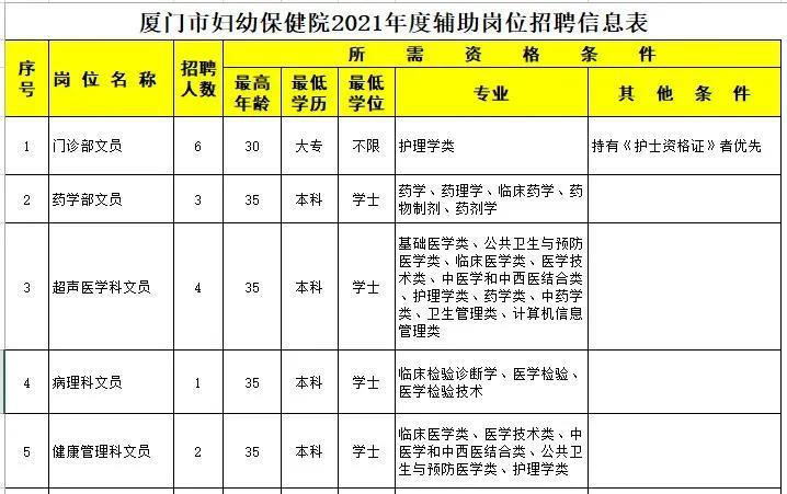 具体的招聘人数、招聘岗位及招聘条件详见《厦门市妇幼保健院辅助岗位工作人员需求信息表(2021年3月)》(附件1)