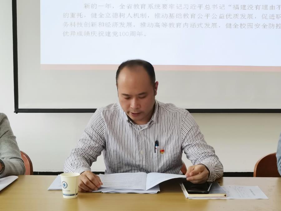 会上,党支部书记向全体参会人员传达了2021年全国和福建省教育工作会议精神。全体同志在会上,共同学习了习近平在党史学习教育动员大会上的强调讲话和福建省党史学习教育动员大会精神。党员同志要将会议精神落到教育教学管理工作中,提升专业化能力,发扬钉钉子精神,切实落实立德树人根本任务,培养德智体美劳全面发展的医护工作者。党员同志要牢记习近平总书记学史明理、学史增信、学史崇德、学史力行的要求,利用福建省党史学习教育得天独厚的基础、条件和优势,学好党史“必修课”。