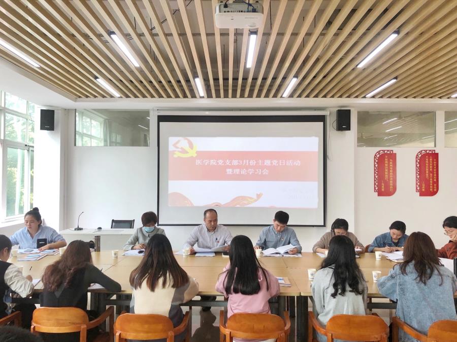 为深入学习贯彻习近平总书记重要讲话、重要指示批示精神和党的十九届五中全会精神落实省市委关于党史学习教育和开展“再学习、再调研、再落实”活动的部署要求。医学院党支部于3月16日在学习大厅开展3月份主题党日活动暨理论学习会。此次会议由医学院党支部书记林俊主持,全体党员教师参会。