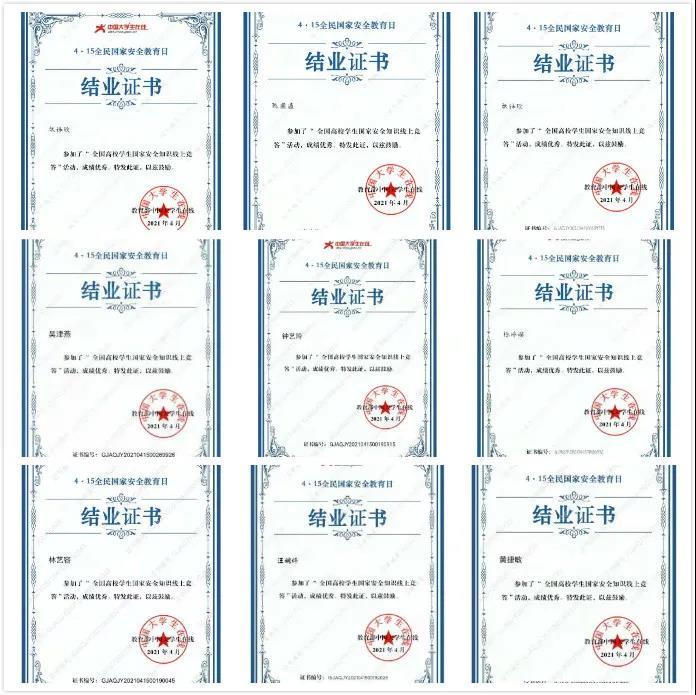 为把国家安全教育渗透到校园每个角落,本次学习内容涵盖了国家安全多方面的内容:分别是观看一堂“千万师生同上一堂国家安全教育课”为主题的公开课、关注一个“中国反邪教”微信公众号、参与一次“全国高校学生国家安全知识线上竞答”、开展一场“反邪教警示教育进校园”活动。活动成果如下:
