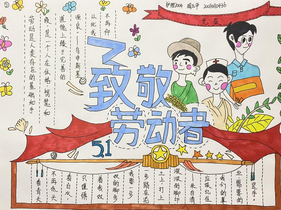 劳动是神奇的,劳动是伟大的。劳动者用勤劳的双手和智慧,编织了这个五彩斑斓的世界,创造了人类的文明创造了我们今天的幸福生活。致敬劳动者,尊重劳动,热爱劳动,是作为大学生的我们义不容辞的责任,让我们一起争做时代的新青年,体会劳动的真谛。