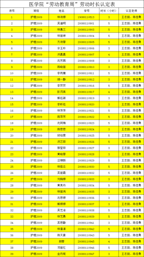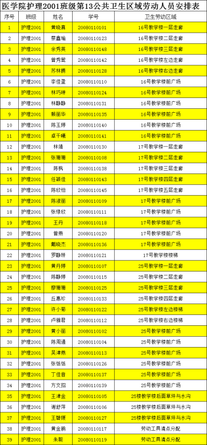 接下来公布第13周护理2001班“劳动周”劳动人员安排表,请查收~