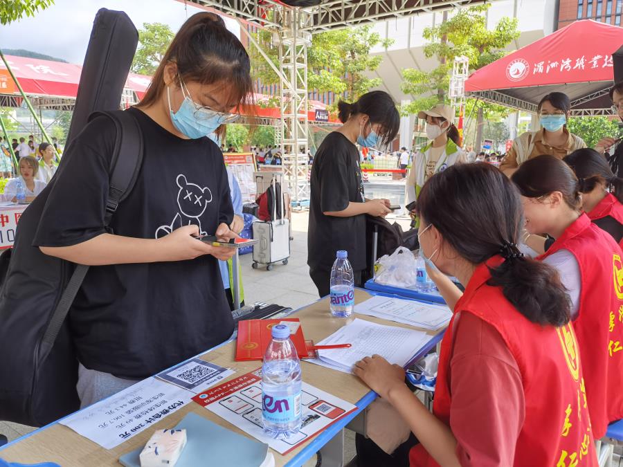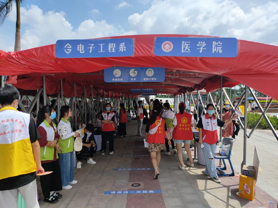 疫情之下防疫工作不可松懈,萌新们在志愿者的引导下,进入校园出示健康码、14天行程、核酸检测报告测,量测体温、查看录取通知书。遮阳棚内整洁有序,学长学姐坚守岗位,小萌新们亲切有礼,进入校门的第一步迈得很踏实。