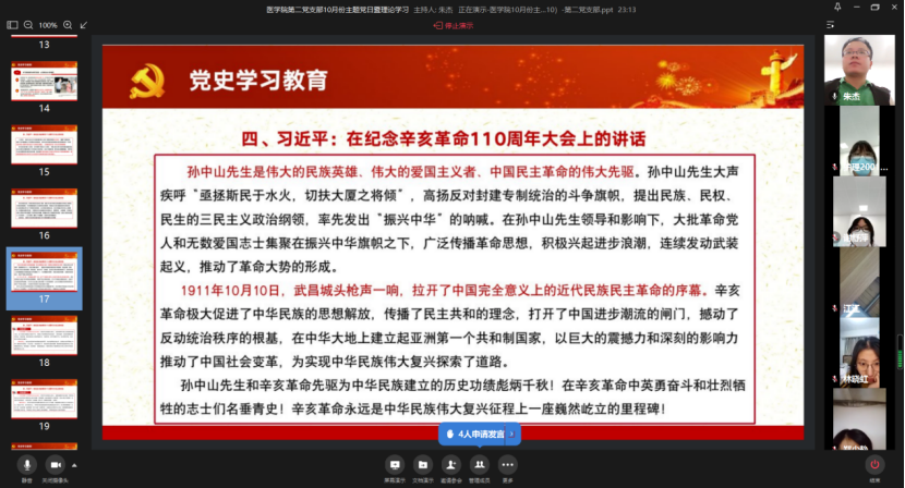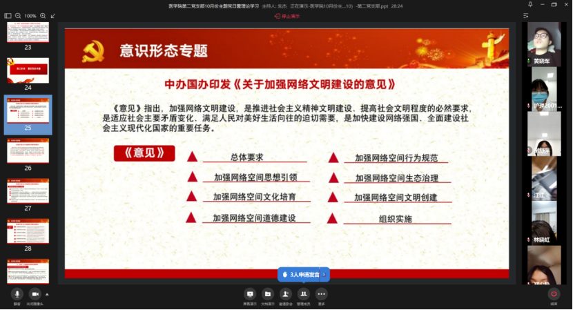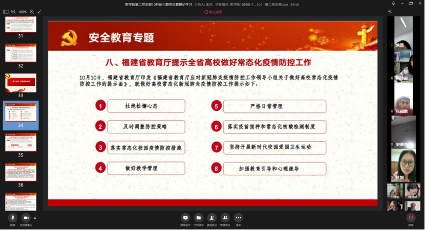 10月24日,医学院第二党支部通过企业微信线上视频开展10月份主题党日活动暨理论学习会。会议围绕党史学习教育、意识形态、安全教育等召开专题学习,并就《习近平在福建》进行学习研讨,进一步推动党史学习教育走深走实。会议由医学院第二党支部书记朱杰老师主持,全体党员参加会议、入党积极分子列席会议。
