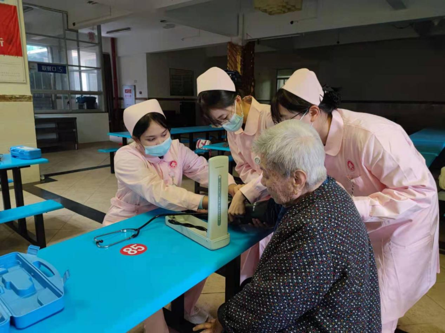 医学院护理专业同学为敬老院老人们测量血压,并为他们讲解一些日常的护理小知识