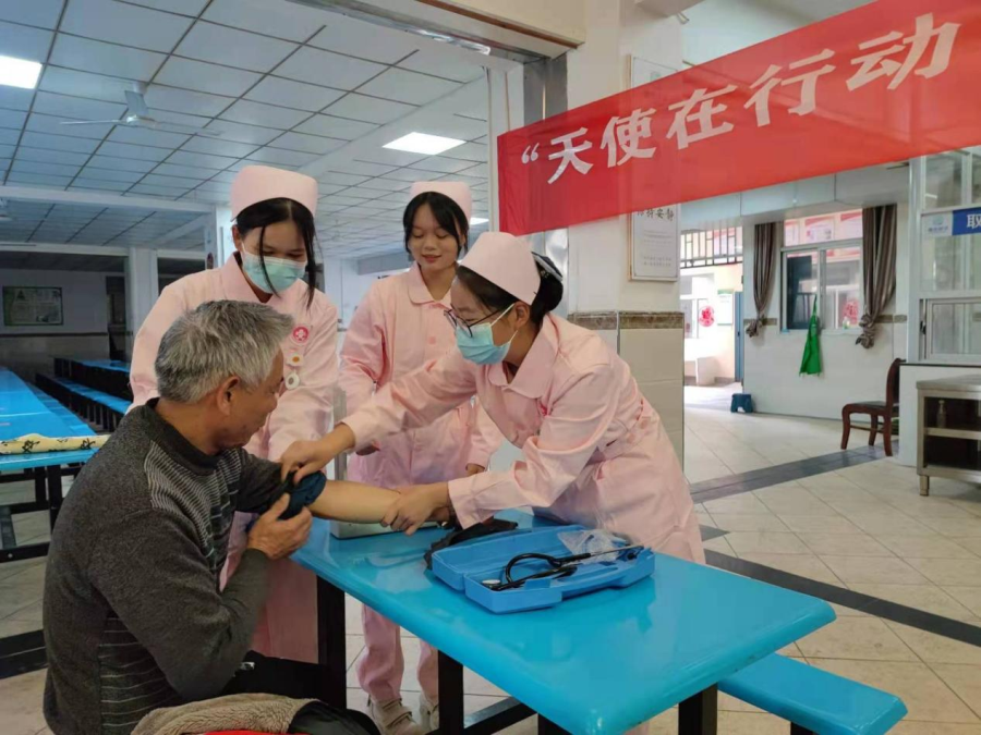 为贯彻落实党的十九届六中全会会议精神,弘扬中华民族尊老敬老的传统美德,进一步发扬医护人员崇高精神,普及和推广便民惠民措施。2021年12月17日上午,湄洲湾职业技术学院医学院的师生及优秀团员走进莆田市夕阳红敬老院,开展主题为“天使在行动,温暖夕阳心”义诊活动。活动期间免费为老人提供测血压、健康咨询、义诊等服务,受到了老人们的热烈欢迎。