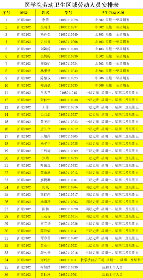 接下来,公示医学院第18周公共卫生区域劳动人员安排,请查收~