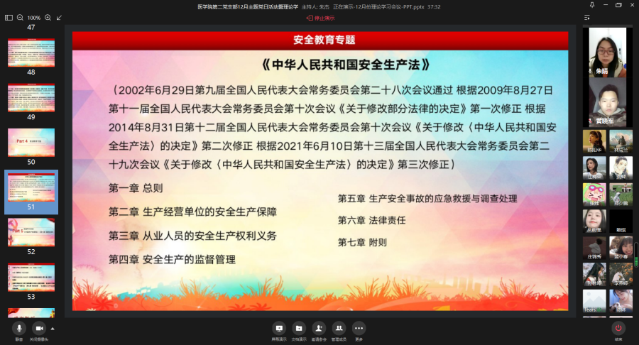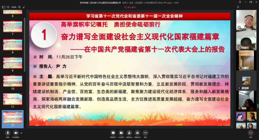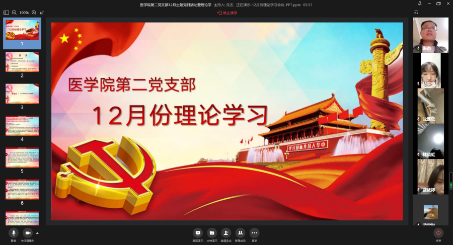 12月26日,为强化支部政治理论学习,加强党员同志作风建设和党风廉洁教育,树立安全责任意识,落实安全稳定工作。医学院第二党支部通过企业微信线上视频开展12月份主题党日活动暨理论学习会。会议围绕学习贯彻习近平法治思想、传达和学习省第十一次党代会和省委十一届一次全会精神、意识形态专题、安全教育和专题学习交流《中国共产党章程》(第七章 党的纪律)五个阶段展开。会议由医学院第二党支部书记朱杰老师主持,全体党员参加会议、入党积极分子列席会议。