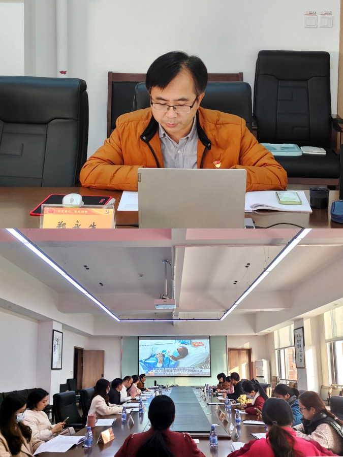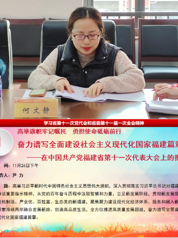 其次,由支部委员何文静老师传达学习省第十一次党代会和省委第十一届一次全会精神,高举旗帜牢记嘱托,勇担使命砥砺前行。总结过去,规划未来。加强组织领导,立足职能职责,奋力推动省党代会精神在师生心中落地生根、走深走实。