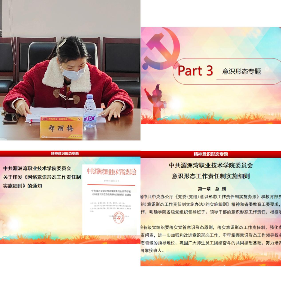 接着,由支部委员郑丽梅老师强调:“意识形态工作是为国家立心、为民族立魂的工作”。我们作为高校的人民教师,更要认清形势,提高认识,切实增强意识形态工作的责任感和使命感;要明确任务,主动担当,进一步提高意识形态工作科学化水平;肩负起举旗帜、聚人心、育新人、兴文化、展形象的使命任务。
