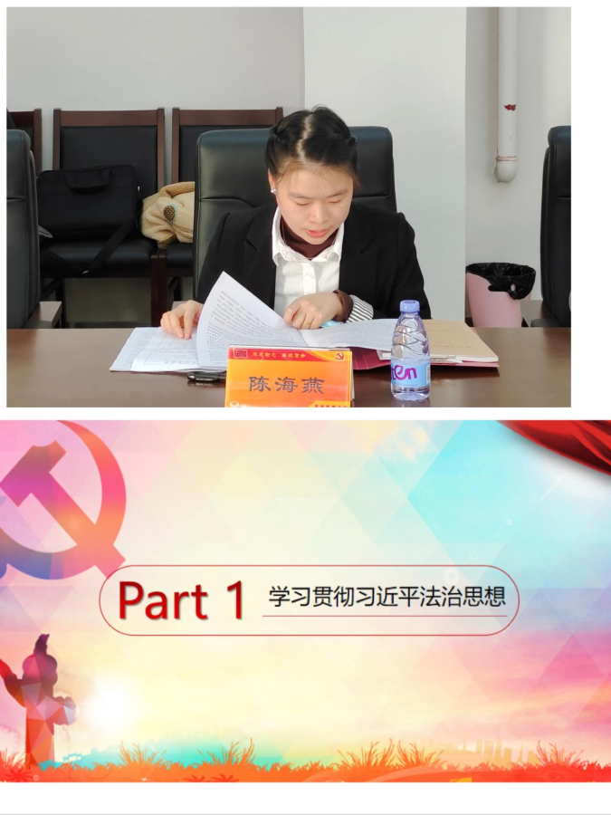 会议首先由支部委员陈海燕老师带领大家学习习近平总书记在中共中央政治局第三十五次集体学习时的强调讲话,全面总结了党的十八大以来中国特色社会主义法治体系建设取得的历史性成就,系统部署了坚持法治体系建设正确方向、加强重要领域和民生领域立法、深化法治领域改革、统筹推进国内法治和涉外法治、加强法治理论研究和宣传等重点工作。