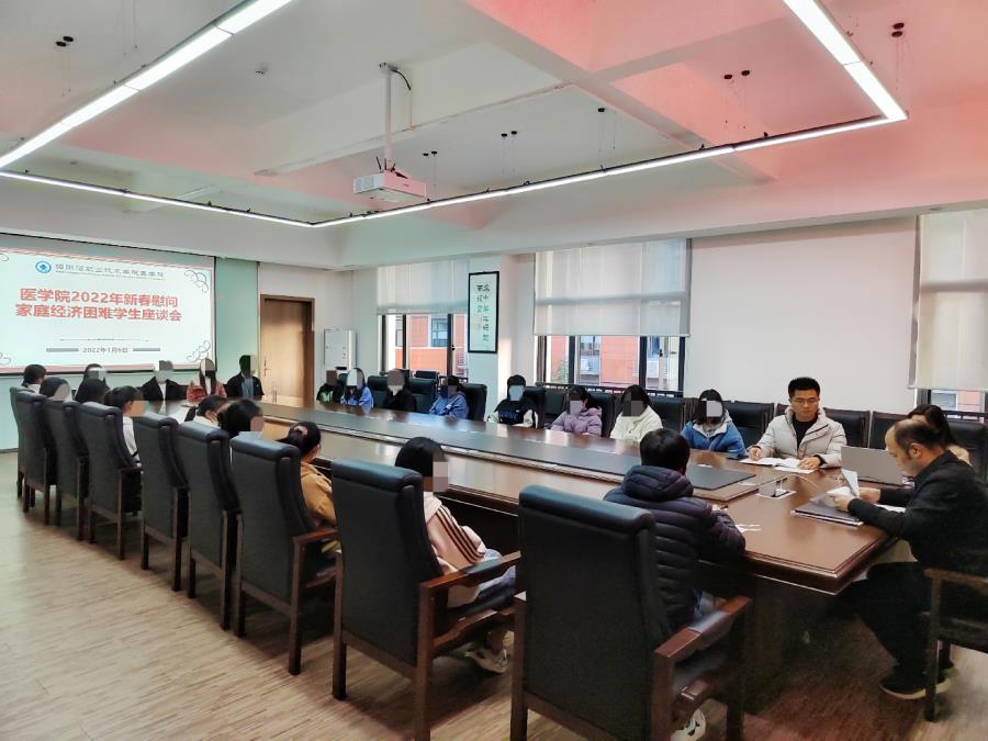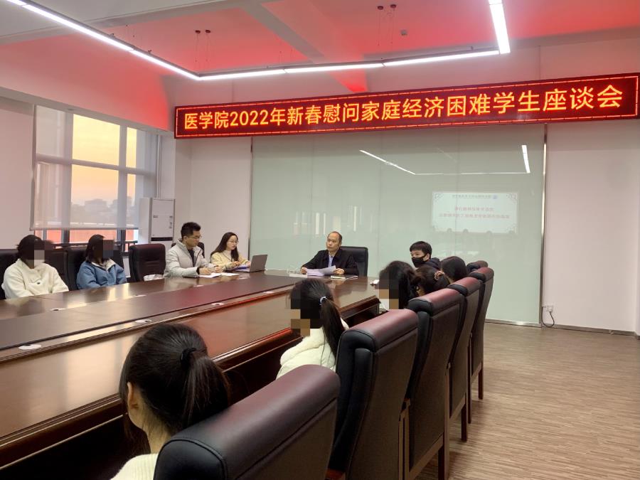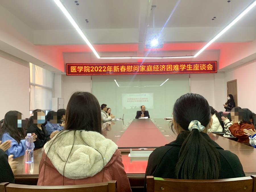 新春佳节之际,为传承和弘扬优秀传统文化,医学院于1月6日下午,在行政楼中303会议室举办了“情暖新春 与爱同行”为主题的新春慰问家庭经济困难学生活动。医学院党总支书记林俊和2021级新生辅导员严溢涵老师、陈佳勇老师、陈凌霆老师以及医学院21名学生参加座谈会,座谈会由严溢涵老师主持。