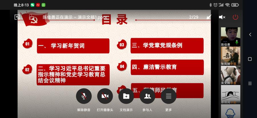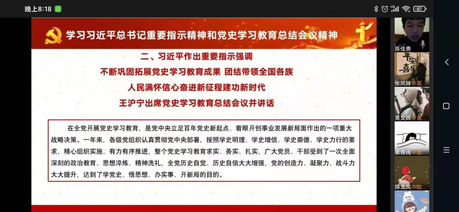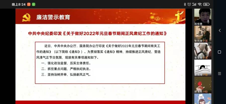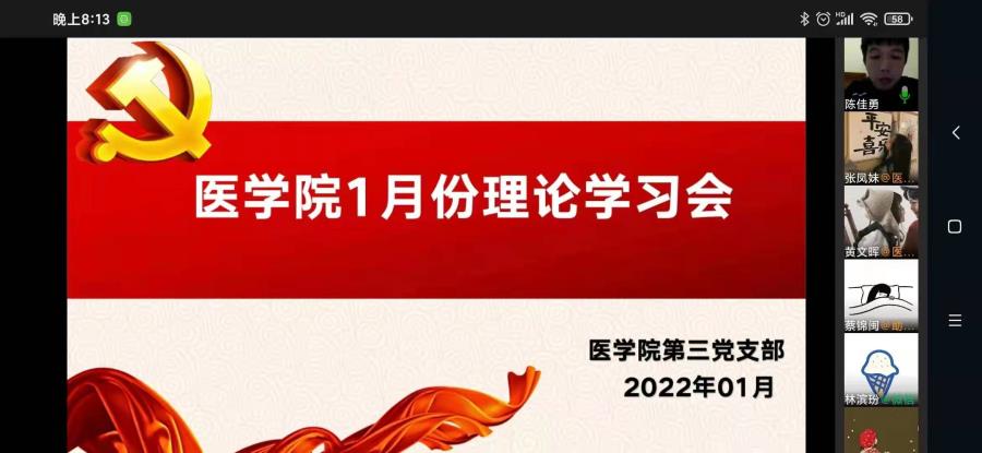 寒假伊始,春节临近,为弘扬中华民族优秀传统节日文化,加强纪律意识,提升师德师风,站好节前最后一班岗,2022年1月13日晚,医学院第三党支部通过企业微信线上开展1月份主题党日活动暨理论学习会。会议围绕学习习近平主席2022年新年贺词、学习习近平总书记重要指示精神和党史学习教育总结会议精神、学党章党规条例、廉洁警示教育、师德师风教育等方面展开,会议由医学院第三党支部书记陈佳勇老师主持,支部全体师生党员参加会议。