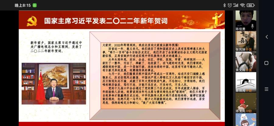 新年前夕,国家主席习近平通过中央广播电视总台和互联网,发表了二〇二二年新年贺词。会议第一阶段,由支部书记陈佳勇老师解读学习2022年新年贺词内容。将近10多分钟的新年贺词虽然时间不长,但意味深长、意义深远,总书记的新年贺词让师生们感受到磅礴伟力,激动人心、激励前进,为我们继续前行的步伐指明了方向。“勇毅坚守,无数追梦人还在奋斗奉献”,所以新的一年要继续不忘初心,继续前进,一起奔向美好未来。