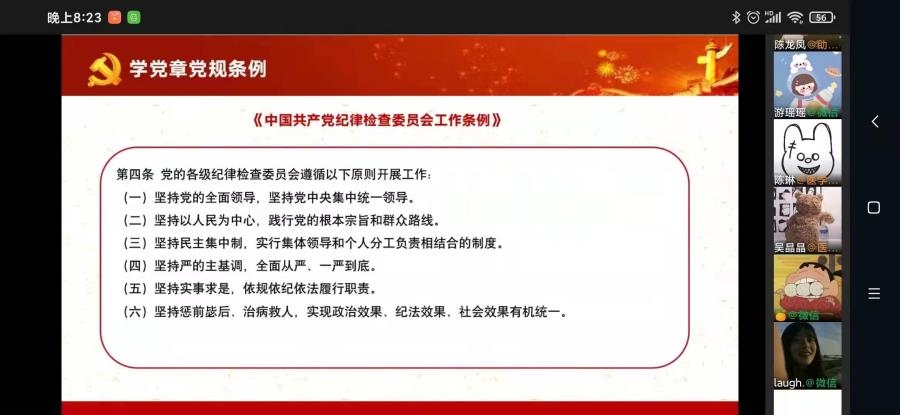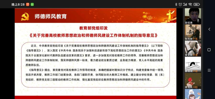 最后,由陈佳勇老师传达了学院纪律检查委员会关于做好2022年元旦春节期间正风肃纪工作的通知和要求,通报了中央纪委国家监委公开通报的十起违反中央八项规定精神典型问题,共同学习了教育部党组印发的《关于完善高校教师思想政治和师德师风建设工作体制机制的指导意见》,希望师生党员们积极预防违规违纪违法问题发生,持续推进正风肃纪,营造风清气正节日氛围,高校教师要落实师德师风第一标准,不断提高政治素质、加强业务能力、提升育人水平。