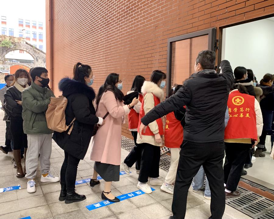 现场多名志愿者协助医护人员对检测的师生进行引导,“10人一组,排好队,保持一米间隔”认真维持好现场秩序,保证采样工作顺利进行。志愿者们忙碌的身影,充分展现出当代大学生良好的精神风貌和担当。检测现场全体师生佩戴口罩,按照一米线距离,有序排队进行核酸检测。医护人员操作熟练,迅速,整个过程有条不紊。