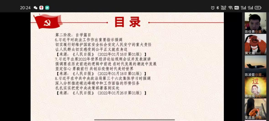 2022年2月27日晚,医学健康系第三党支部通过企业微信线上开展2月份理论学习会议,会议主要围绕关于习近平总书记在《求是》杂志发表不断做强做优做大我国数字经济、努力成为可堪大用能担重任的栋梁之才的文章及习近平总书记对政法工作作出重要指示强调等文件精神进行集中学习。学习会由医学健康系第三党支部书记陈佳勇老师主持,全体党员和入党积极分子参与。