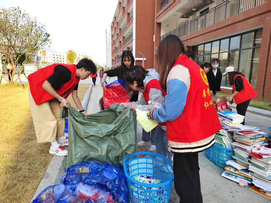 一盆盆绿植在阳光的照耀下生机勃勃,为湄园的春天增添满满的绿意。活动尚未开始,现场已经排起了长龙,同学们都积极踊跃的参加本次活动,或是拿着清洗、分类好的瓶罐或是提着打包好的纸箱、书本,都等待着领养属于自己的“小绿”。活动开始后,同学们有秩序地扫码登记,记录自己的“环保指数”,做湄园的低碳卫士。经过志愿者的细心分捡,那些可回收的瓶罐纸箱被整齐的堆叠、收整起来,等待进入下一个循环生产利用周期。