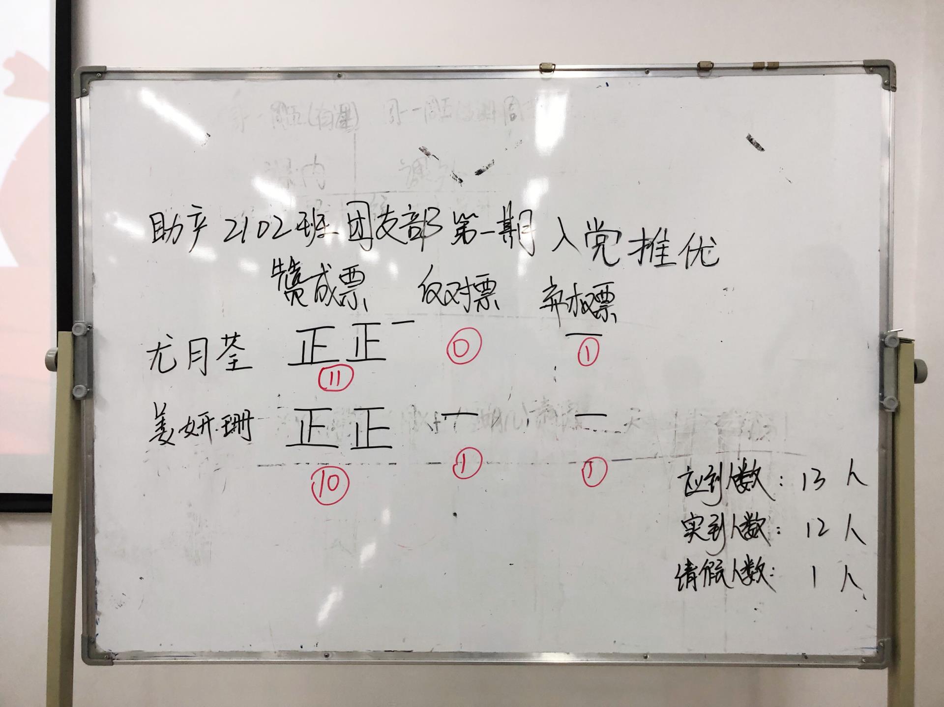 助产2102班团支部推优大会,由该班团支书兼班长尤月荃同学主持。姜妍珊、尤月荃同学进行了自荐演讲,表明了自己积极向党组织靠拢的决心。最终,姜妍珊同学获得赞成票10票,反对票1票,弃权票1票。尤月荃同学获得赞成票11票,反对票0票,弃权票1票。符合选举规定,顺利进入考察环节。