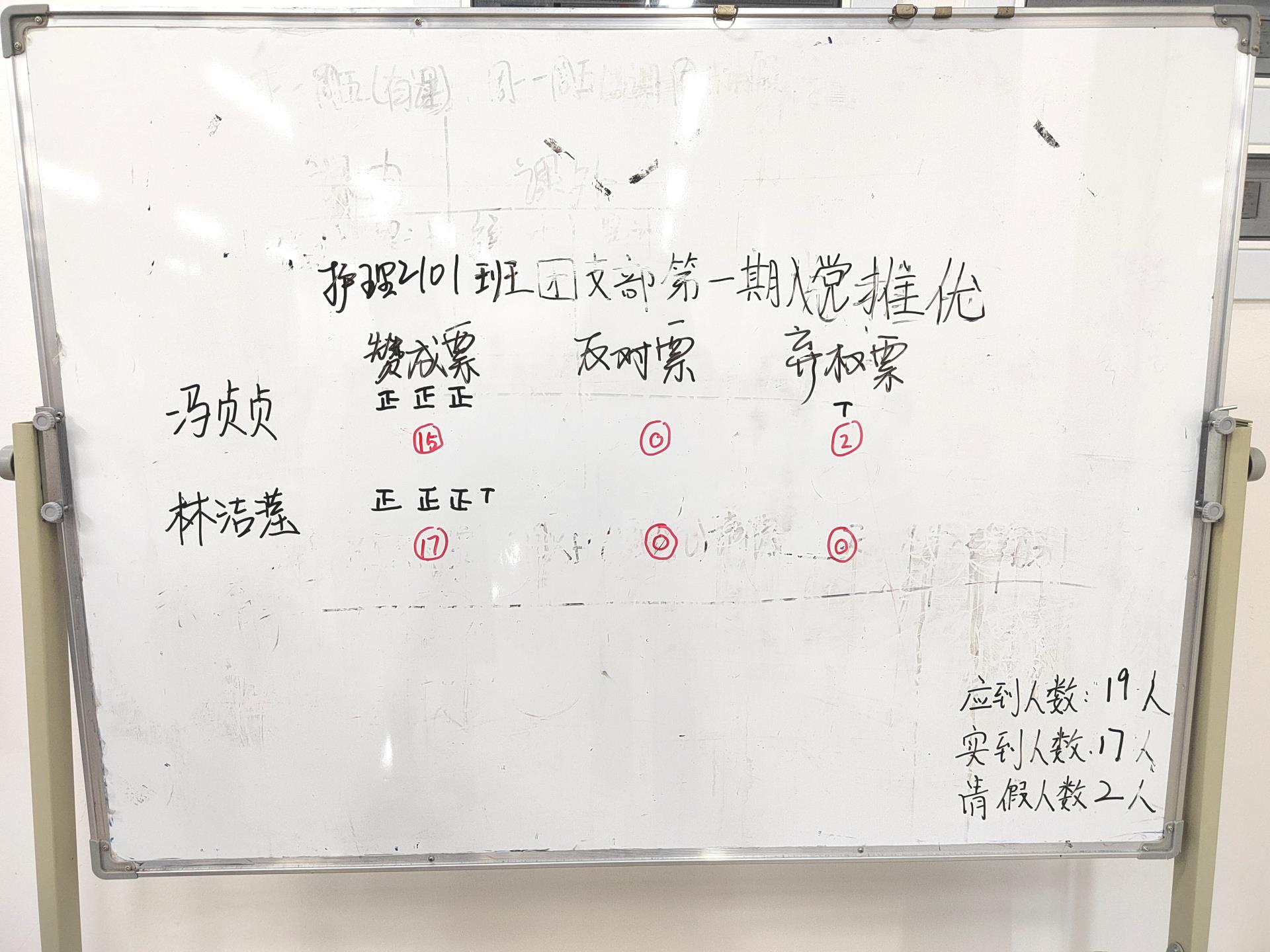 护理2101班团支部推优大会,由该班团支书兼班长林洁滢同学主持,主持人首先介绍了推优大会的流程和投票规则。随后候选人林洁滢、冯贞贞同学进行自荐演讲,他们的眼中透着坚定跟党走的决心和信念。最终,林洁滢同学获得赞成票17票,反对票0票,弃票0票。冯贞贞同学获得赞成票15票,反对票0票,弃权票2票。符合选举规定,顺利进入考察环节。