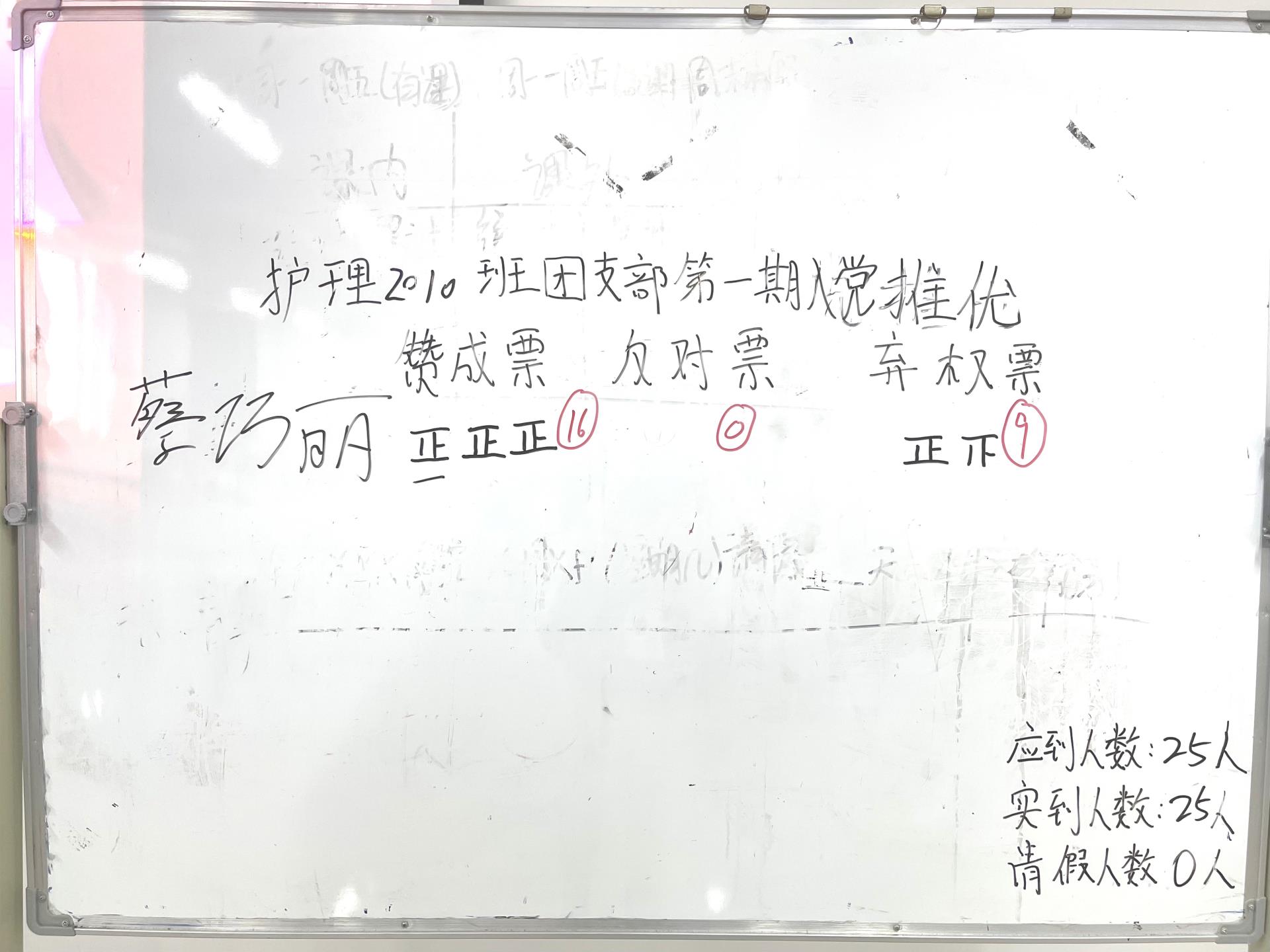 护理2010班班长兼团支书谢鹏程同学主持推优大会。此班的候选人是蔡巧丽同学。候选人进行了慷慨激昂的自荐演讲。表达了自己想加入中国共产党的愿望与信心。最终,蔡巧丽同学获得赞成票16票,反对票0票,弃权票9票。符合选举规定,顺利进入考察环节。