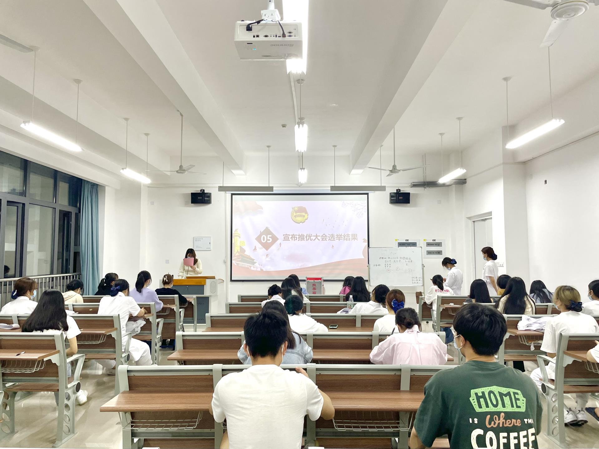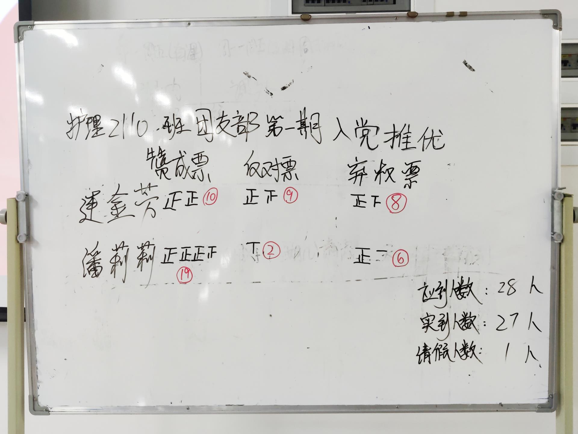 护理2110班团支部推优大会,由该班团支书兼班长杨秋娴同学主持。候选人连金芳同学和潘莉莉同学进行了慷慨激昂的自荐演讲,最终,潘莉莉同学赞成票19票,反对票2票,弃权票6票。连金芳同学获得了赞成票10票,反对票9票,弃权票8票。其中潘莉莉同学票数符合选举规定,顺利进入考察环节。