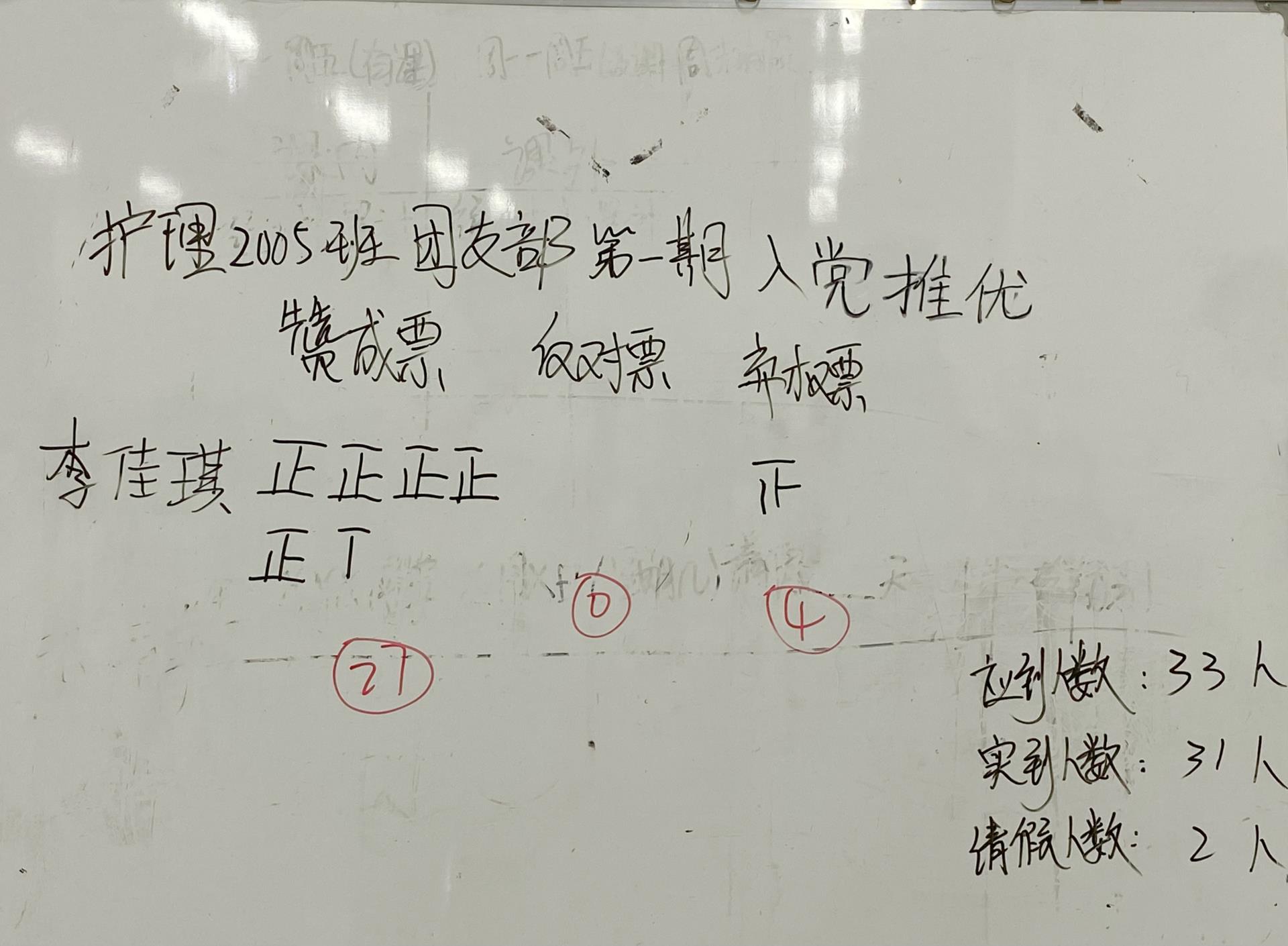 护理2005班团支部推优大会,由该班团支书兼班长陈梦婷同学主持。候选人李佳琪同学努力学习科学文化知识,积极完善自己的思想觉悟,关心同学,团结集体,与人为善助。随后,李佳琪同学进行了自荐演讲。最终,李佳琪同学获得了赞成票27票,反对票0票,弃权票4票。符合选举规定,顺利进入考察环节。