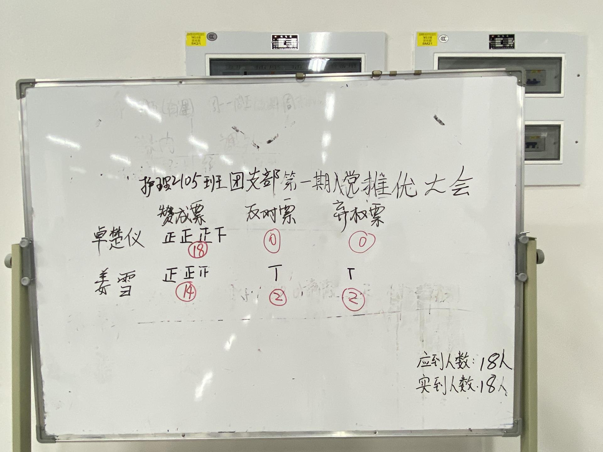 护理2105班由班长兼团支书王瑜馨同学主持本次推优大会。此班的候选人是卓楚仪同学、姜雪同学。两位“推优”候选人重点阐述了入团动机、工作状况和今后努力的方向等,表达了自己对加入共产党组织的信心和决心。经团员们投票表决,最终,卓楚仪同学获得了赞成票18票,反对票0票,弃权票0票。姜雪同学赞成票14票,反对票2票,弃权票2票。符合选举规定,顺利进入考察环节。