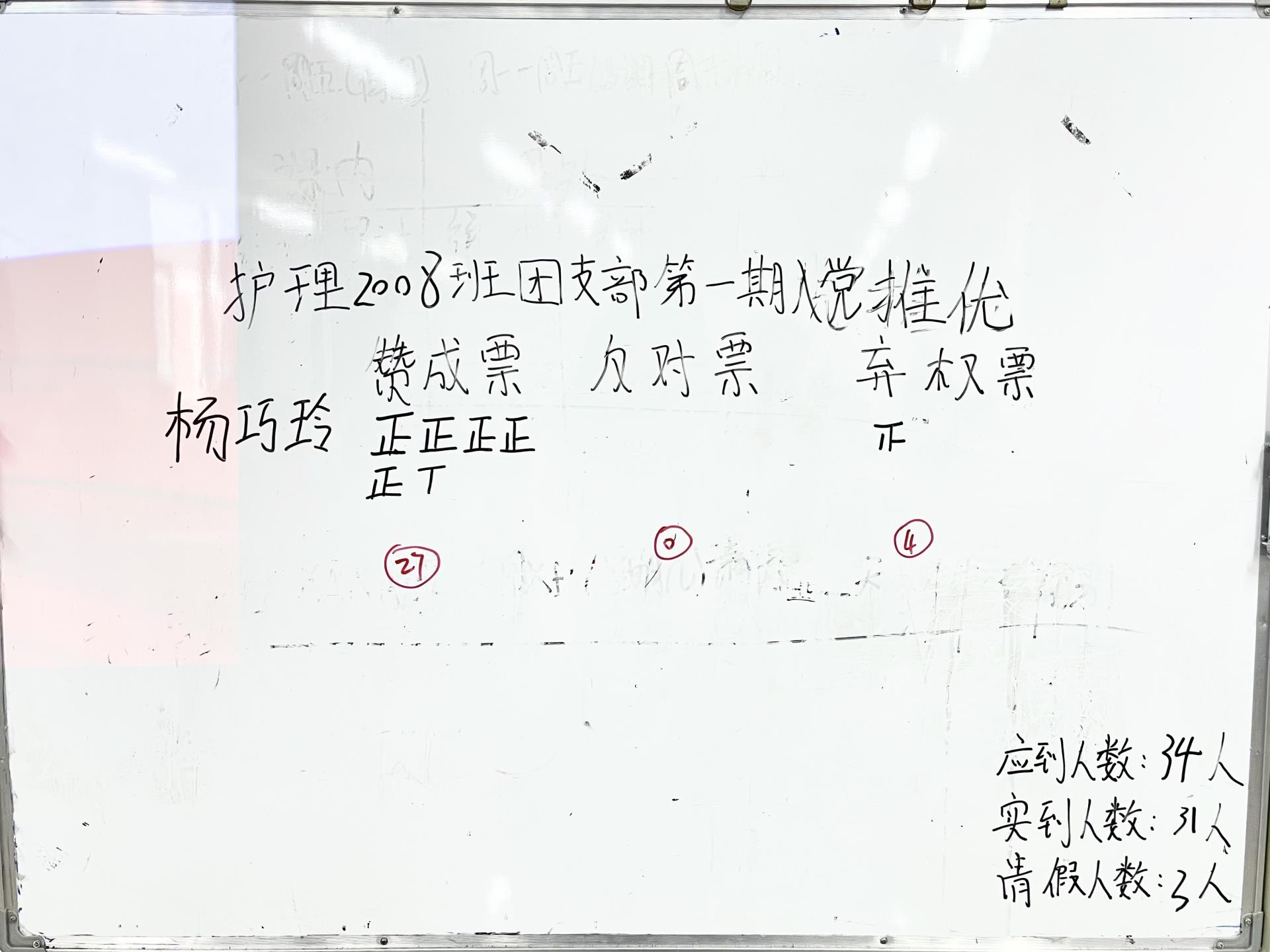 护理2008班班长兼团支书王艺杰同学主持推优大会。候选人杨巧玲同学仔细分析汇报了自己的情况,并认真反思了自己的不足,表达了对加入共产党的向往和将继续努力、接受共青团考验的决心。最终,杨巧玲同学获得赞成票27票,反对票0票,弃权票4票。符合选举规定,顺利进入考察环节。