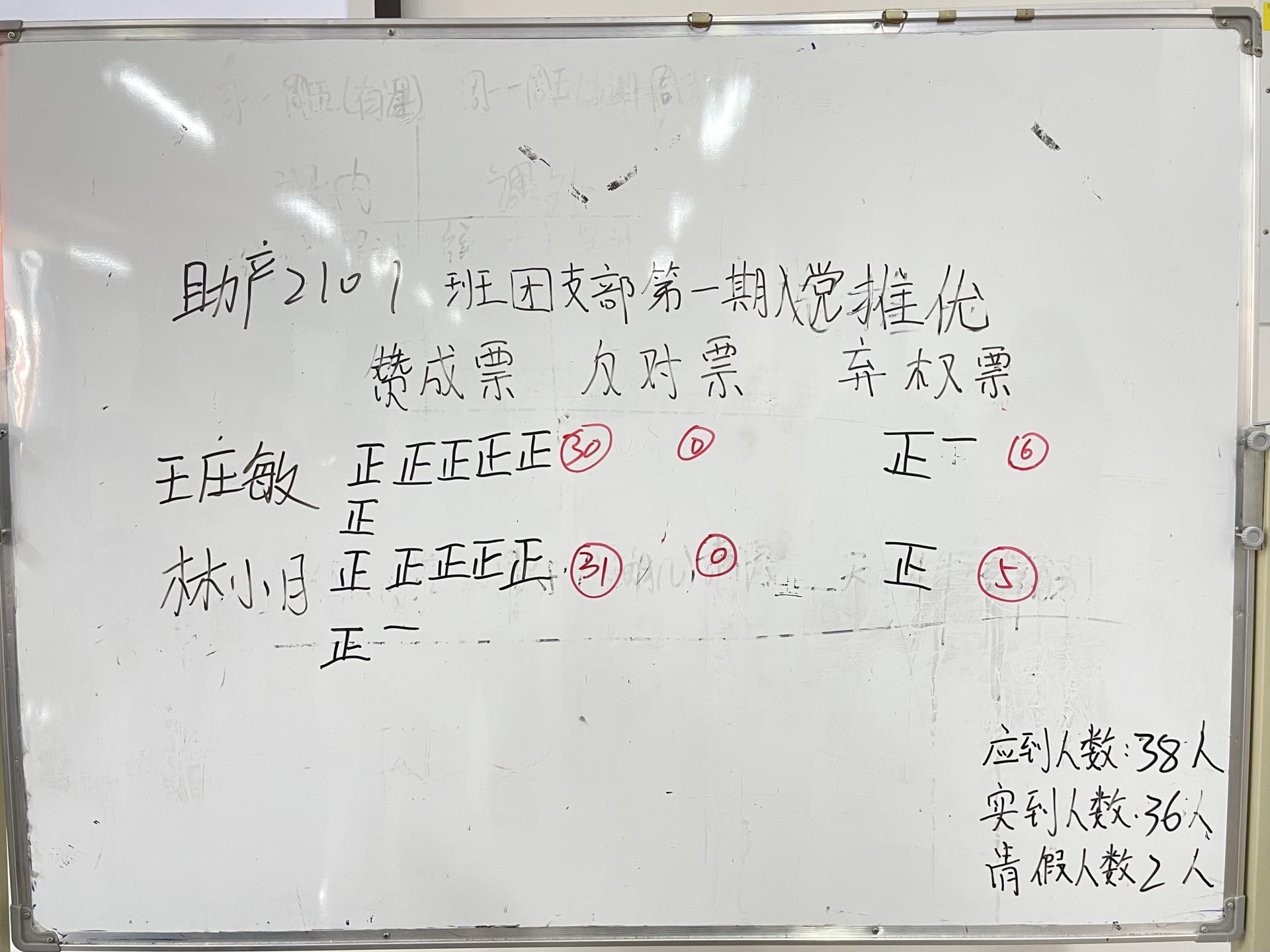 助产2101班团支部推优大会,由该班团支书兼班长王庄敏同学主持。大会伊始,她详细介绍入团程序,并表明大会将始终秉承公平、公正、公开的原则,坚持高标准、高要求,严格按照会议程序进行推优,保证了推优工作质量。接着候选人林小月、王庄敏同学先后进行了自荐演讲。最终,林小月同学获得赞成票31票,反对票0票,弃权票6票。王庄敏同学获得赞成票30票,反对票0票,弃权票6票。符合选举规定,顺利进入考察环节。