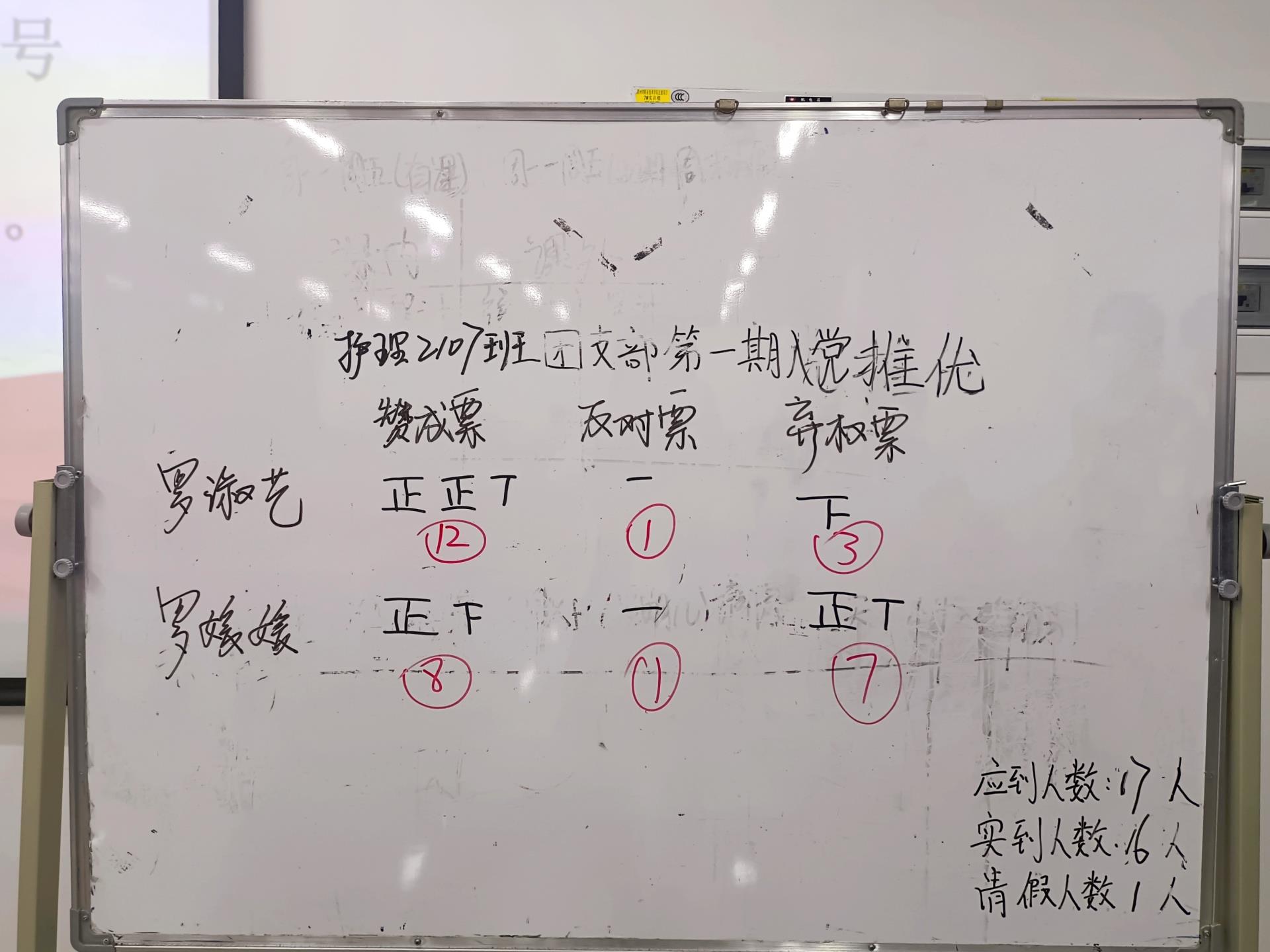 护理2107班的推优大会由班长兼团支书罗嗣琪同学主持。该班的候选人是罗媛媛同学和罗淑艺同学。2位候选人依次进行了竞选演讲,她们向大家陈述了自己思想政治、道德品行、专业学习、学生工作和生活纪律等方面的情况。最终,罗淑艺同学获得了赞成票12票,反对票1票,弃权票3票。罗媛媛同学赞成票8票,反对票1票,弃权票7票。其中罗淑艺同学符合选举规定,顺利进入考察环节。