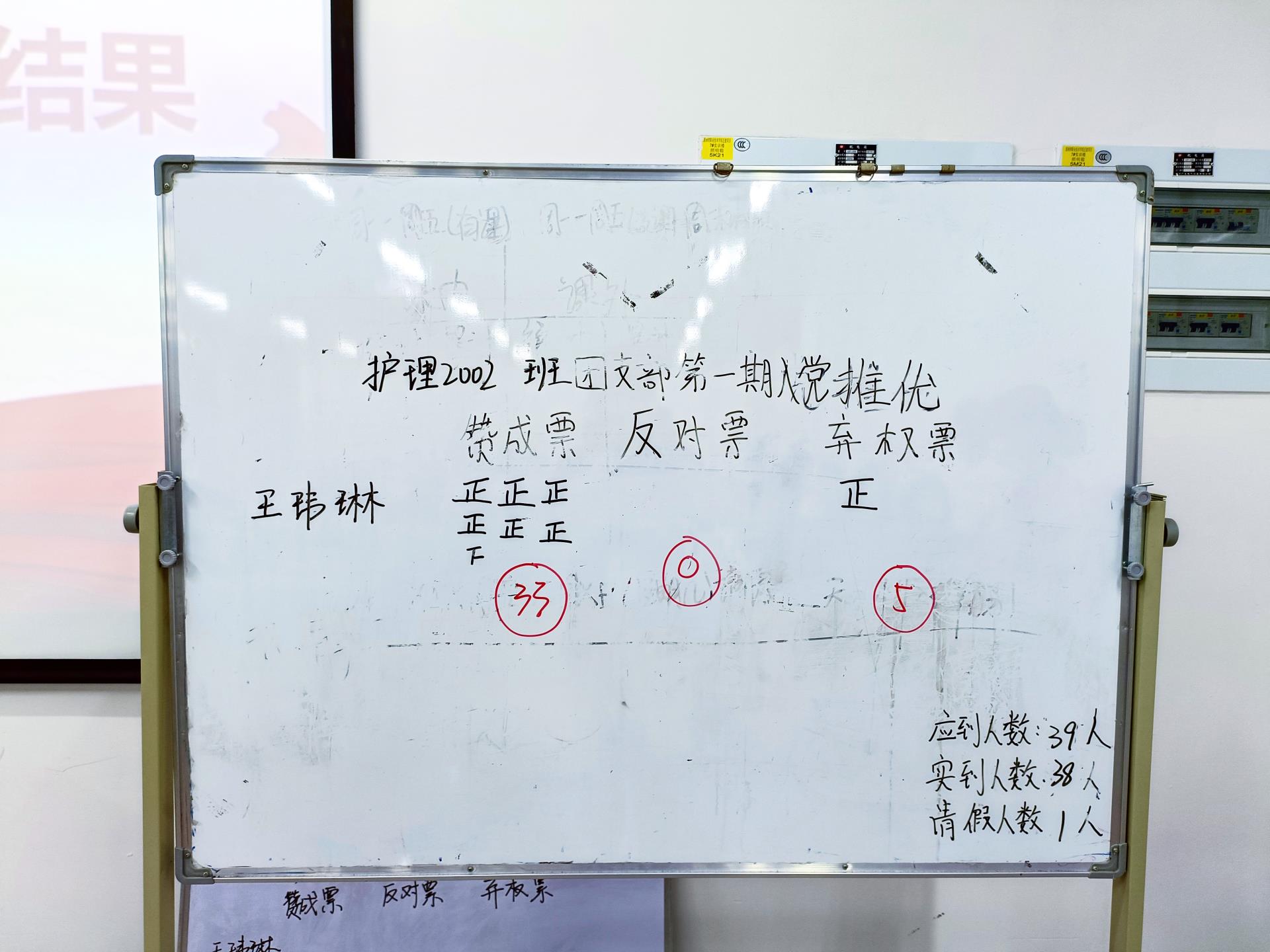 护理2002班团支部推优大会,由该班团支书兼班长蔡棉棉同学主持,在推优大会开始前,参会人员都按时到场,有序就坐,主持人强调了本次推优大会的会场秩序并要求全体成员以严肃的态度对待本次大会。候选人王玮琳同学宣读入党自荐书,以表入党决心。最终,王玮琳同学获得赞成票33票,反对票0票,弃权票5票。符合选举规定,顺利进入考察环节。