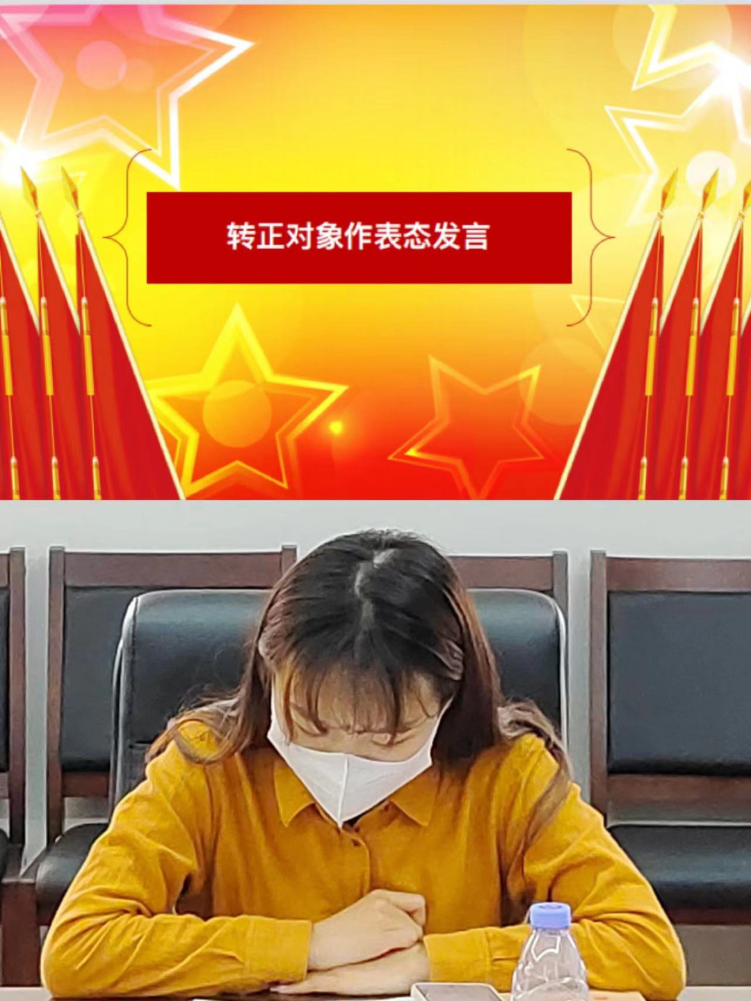 全体到会正式党员经过无记名投票表决,一致同意梁欣同志按期转为中共正式党员。梁欣同志对到会党员提出的建议做表态发言,继续认真履行《党章》规定的各项义务,注重党员形象,努力发挥先锋模范作用,不忘入党誓言,牢记党的宗旨,树立坚定信念,脚踏实地的为实现党在现阶段的基本纲领而奋斗。