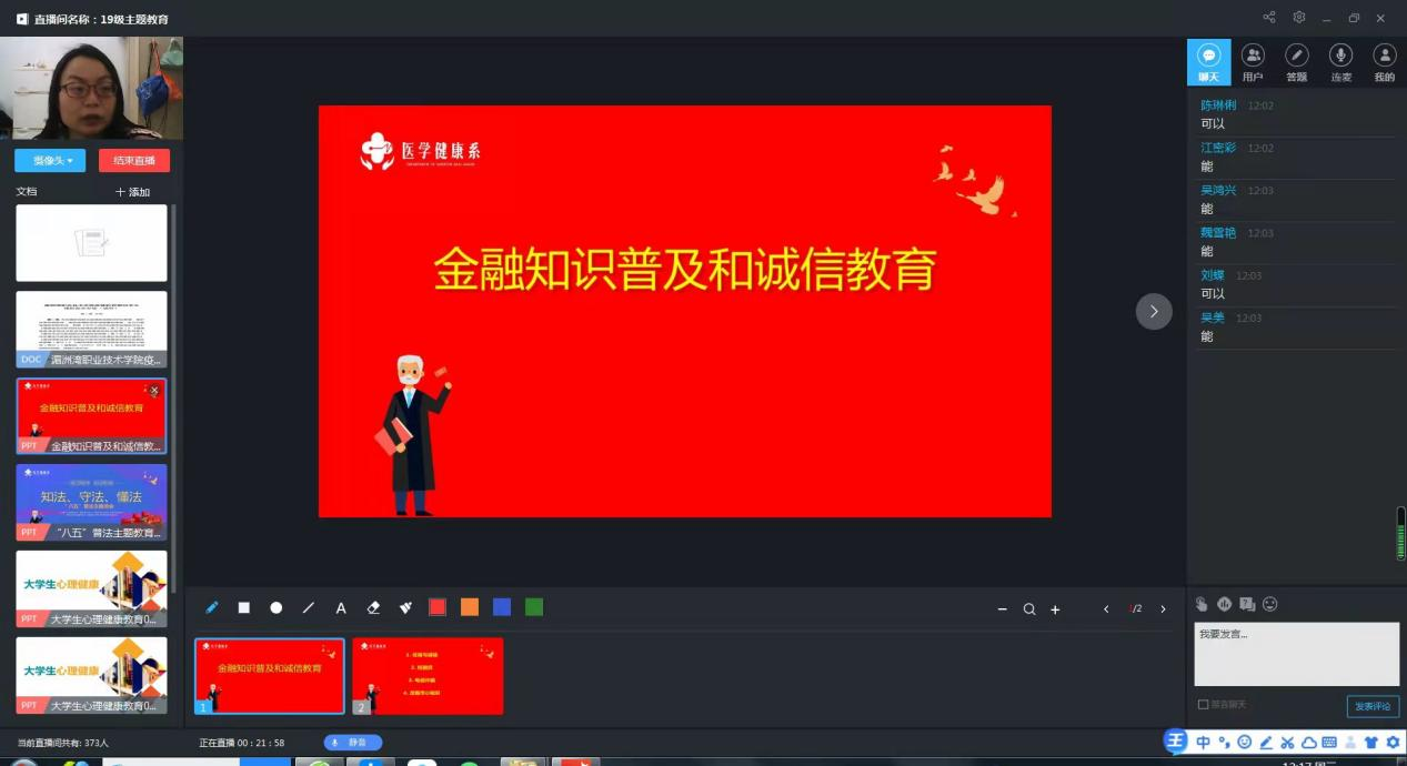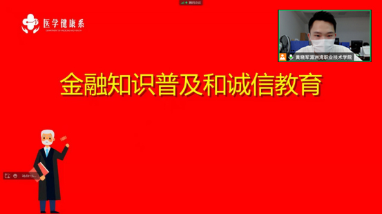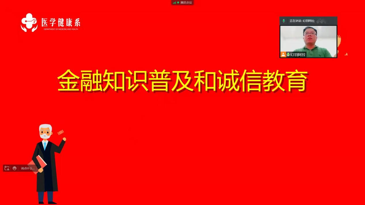 “君子之言,信而有征,故怨远于其身”,诚信是中华民族的传统美德,是每个人的立身之本。为落实立德树人根本任务,增强学生的诚信意识、风险防范意识、感恩意识和责任担当,引导学生培育和践行社会主义核心价值观,弘扬诚信文化,厚植诚信理念,医学健康系于4月22日开展“金融知识和诚信教育讲座”专题云讲座。
