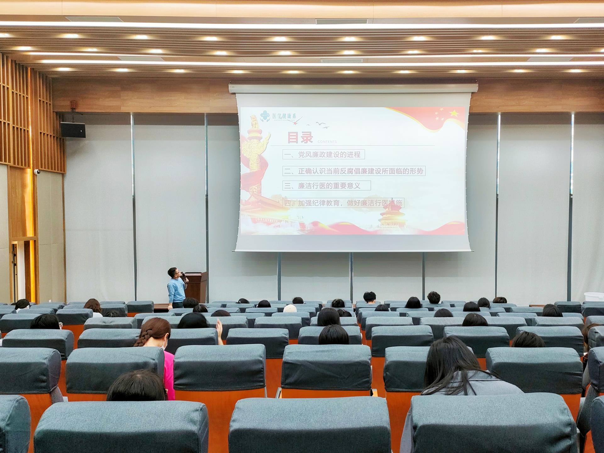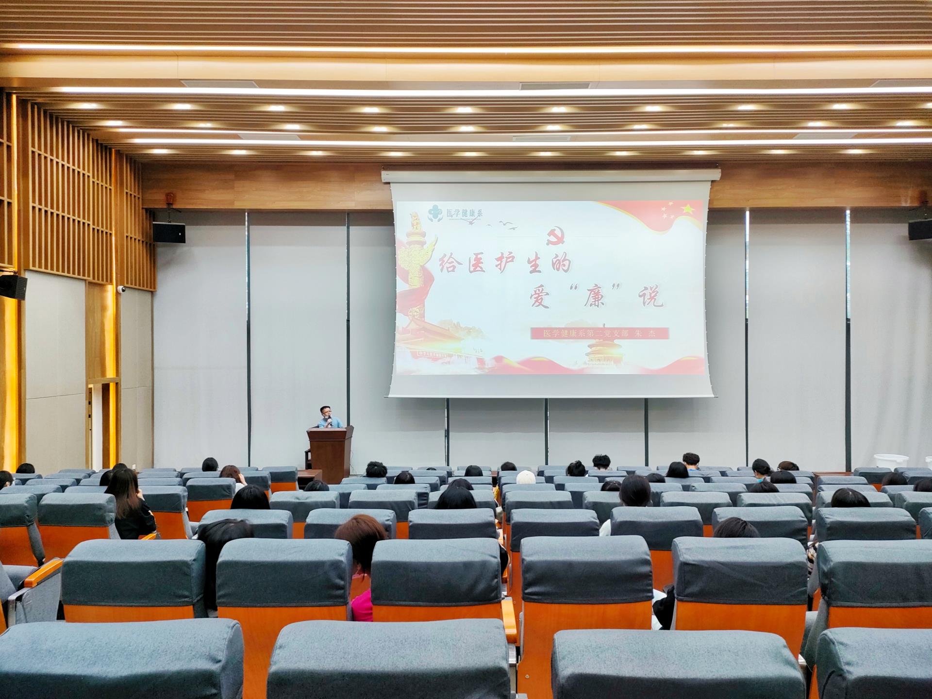 为深化新时代廉洁文化建设,提高医护生对廉洁行医的意识,引导同学们扣好廉洁从医的“第一粒扣子”,5月12日,医学健康系第二党支部书记朱杰在信息楼330人报告厅开展以《给医护生的爱“廉”说》为主题,为即将踏上临床实习岗位的医护生上了一堂生动形象的廉洁教育专题党课。