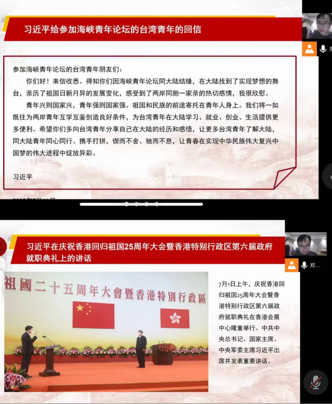 会议开始,由支部组织委员郑永生老师就《习近平给参加海峡青年论坛的台湾青年的回信》和《习近平在庆祝香港回归祖国25周年大会暨香港特别行政区第六届政府就职典礼上的讲话》进行解读。青年兴则国家兴,青年强则国家强,愿更多的台湾青年了解大陆,同大陆青年同心同行、携手打拼,锲而不舍、驰而不息,让青春在实现中华民族伟大复兴中国梦的伟大进程中绽放异彩。
