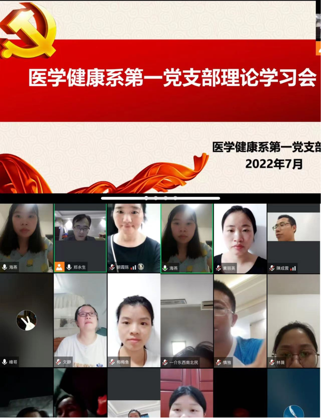 为深入推进党史学习教育,进一步做到学史明理、学史增信、学史崇德、学史力行,教育引导全党同志学党史、悟思想、办实事、开新局。2022年7月31日晚上7点半,医学健康系第一党支部在线上开展7月份主题党日活动暨理论学习会,会议就习近平讲话、更好把握和运用党的百年奋斗历史经验等专题进行学习。会议由医学健康系第一党支部书记李钟峰老师主持,全体党员参会,部分入党积极分子列席参与。