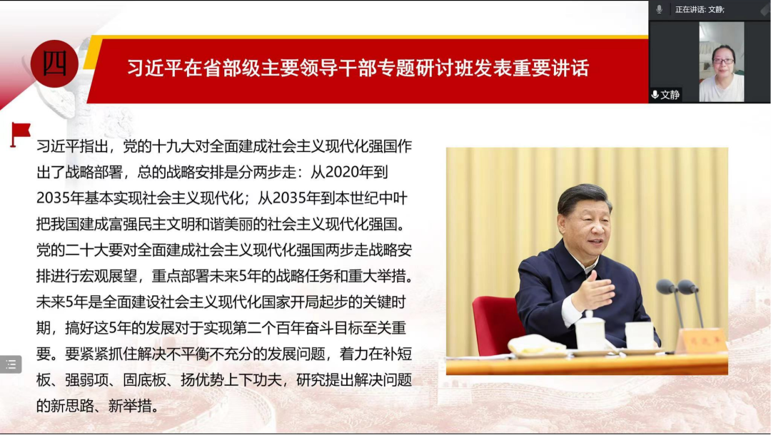 紧接着,由支部统战委员何文静老师就《习近平在省部级主要领导干部专题研讨班发表重要讲话》展开学习。习近平总书记强调,全面建设社会主义现代化国家,实现新时代新征程各项目标任务,关键在党。必须持之以恒推进全面从严治党,深入推进新时代党的建设新的伟大工程,以党的自我革命引领社会革命。并指出前进道路上,全党要坚持全心全意为人民服务的根本宗旨,树牢群众观点,贯彻群众路线,尊重人民首创精神,坚持一切为了人民、一切依靠人民,从群众中来、到群众中去,始终保持同人民群众的血肉联系,始终接受人民批评和监督,始终同人民同呼吸、共命运、心连心。