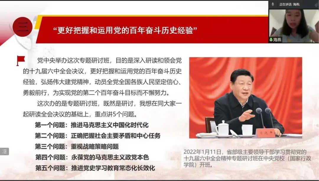 接着,由支部宣传委员陈海燕老师带领大家回顾学习《更好把握和运用党的百年奋斗历史经验》。主要从以下5个问题进行研读探讨:一、推进马克思主义中国化时代化;二、正确把握社会主要矛盾和中心任务;三、重视战略策略问题;四、永葆党的马克思主义政党本色;五、推进党史学习教育常态化长效化。全党同志要更好把握和运用党的百年奋斗历史经验,弘扬伟大建党精神,动员全党全国各族人民坚定信心、勇毅前行,为实现党的第二个百年奋斗目标而不懈努力。