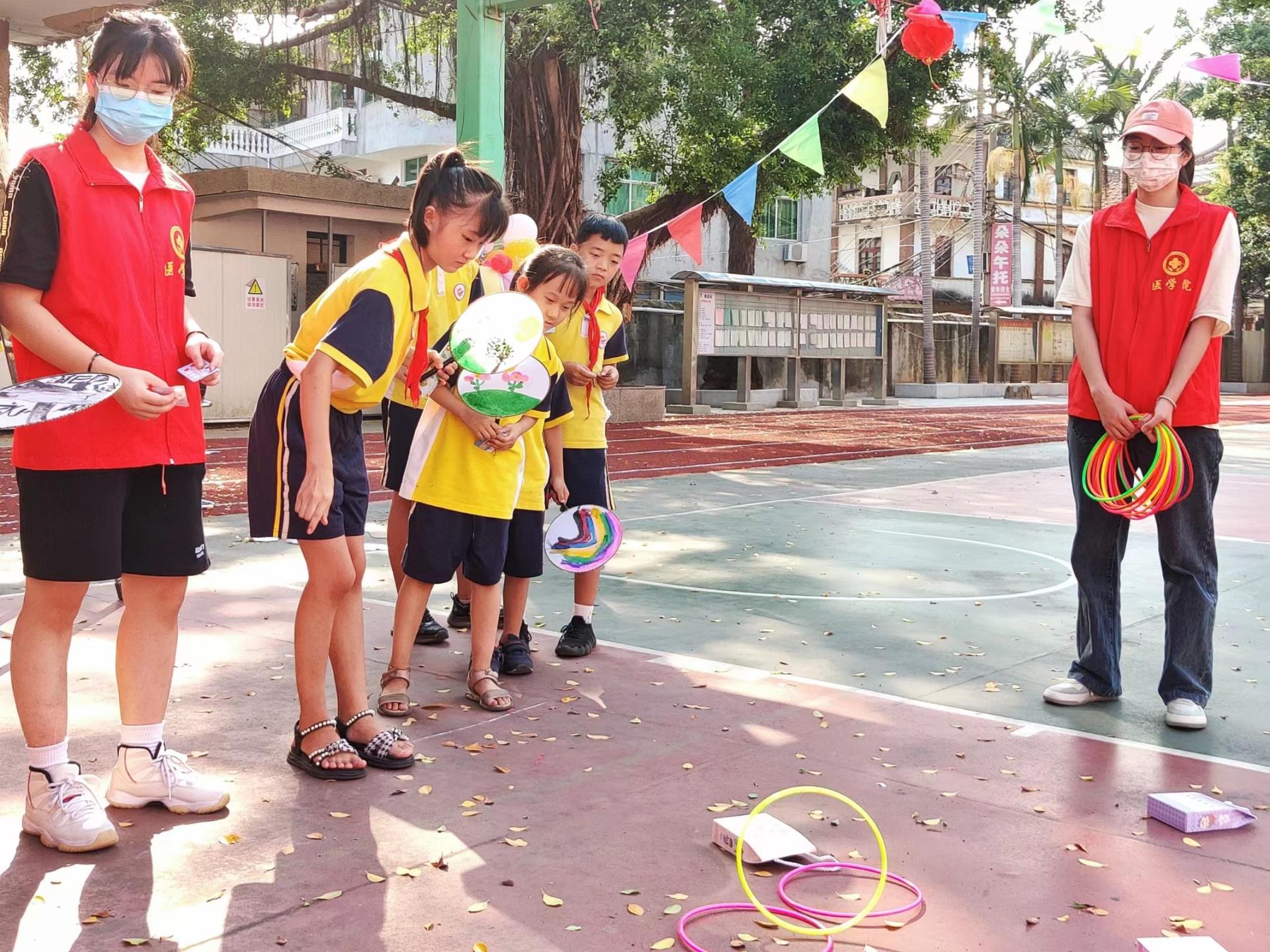 参加套圈的选手们站得笔直,腰部以上前倾,准备、瞄准,盯着一个目标,“倏”的一下,手中的套圈笔直的飞向目标物。活动现场气氛热烈,大家跃跃欲试、信心满满。参加活动的小朋友们各显身手,周围也不断爆发出喝彩声。