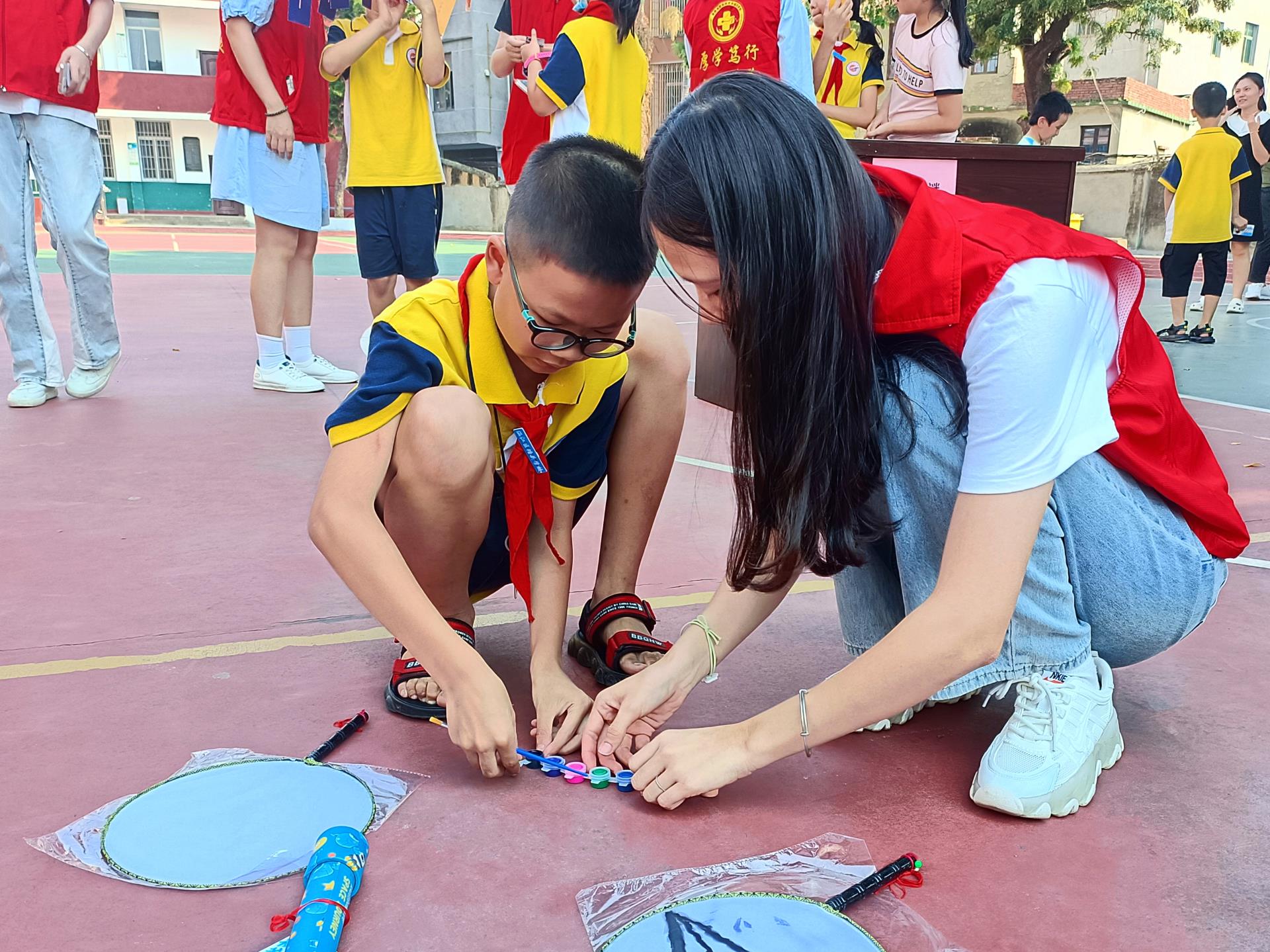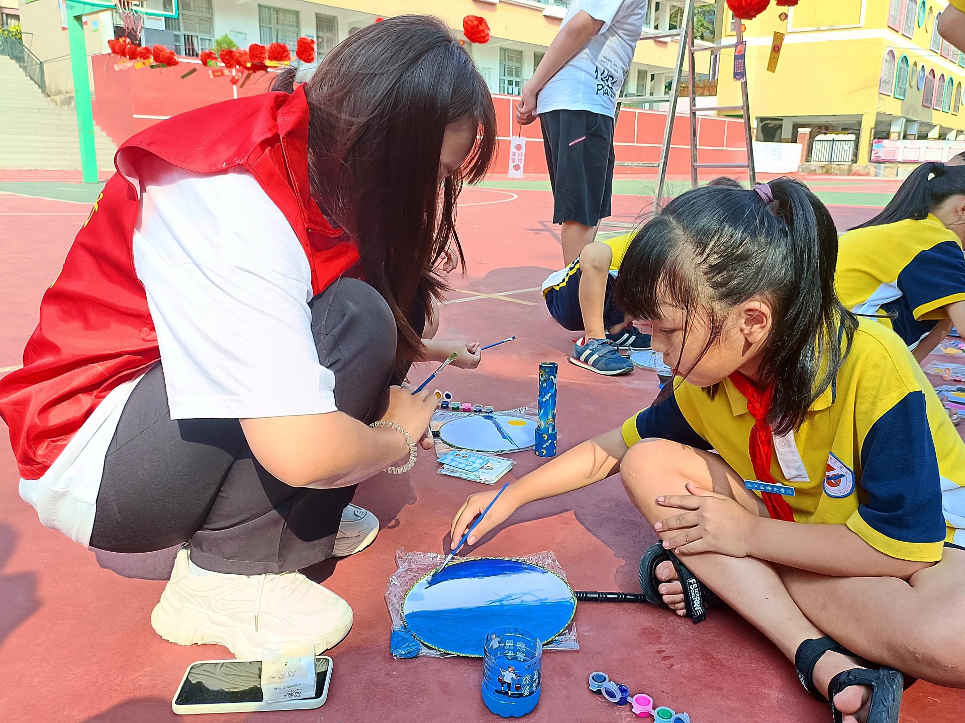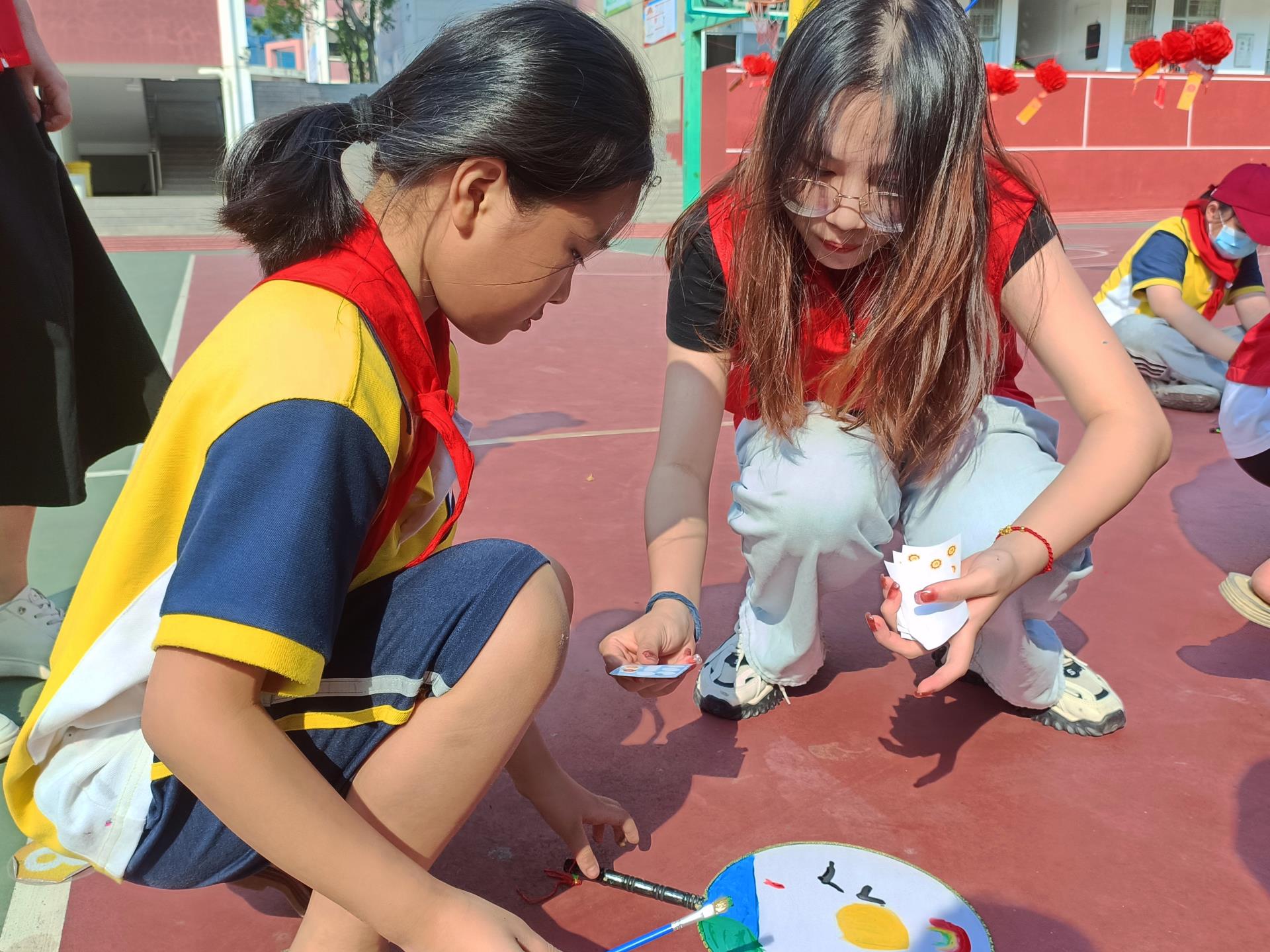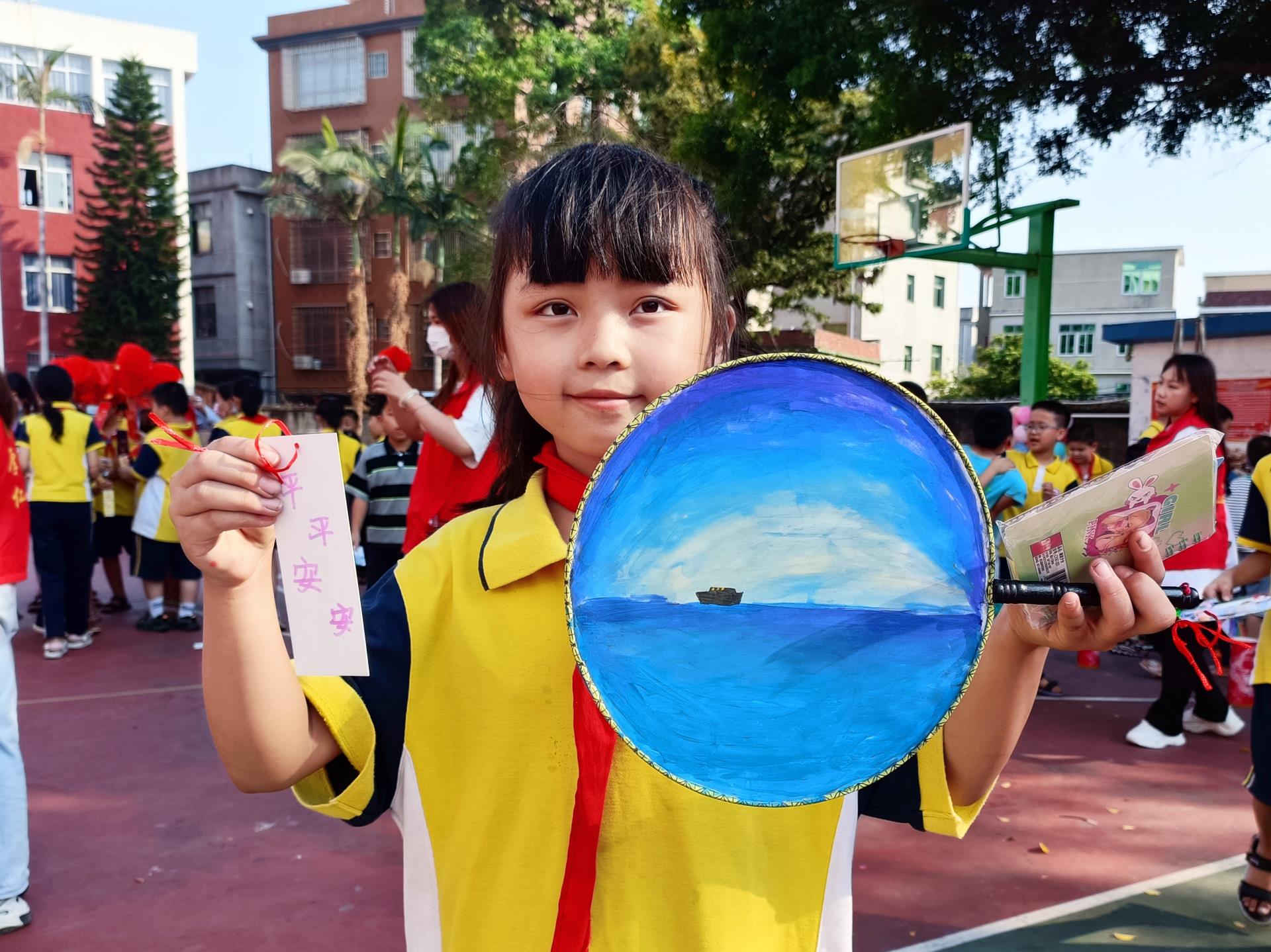 中秋拜月,团扇寄情。香樟树下,挥毫落纸,丹青绘乾坤,一把把色彩斑斓、独具特色的水墨团扇作品在小朋友的画笔下孕育而生,别有一番韵味!孩子们在笔墨中绘出对传统文化的喜爱,一张张洋溢着幸福的脸庞与一幅幅独一无二的团扇作品相互辉映,中秋的情意跃然扇面。