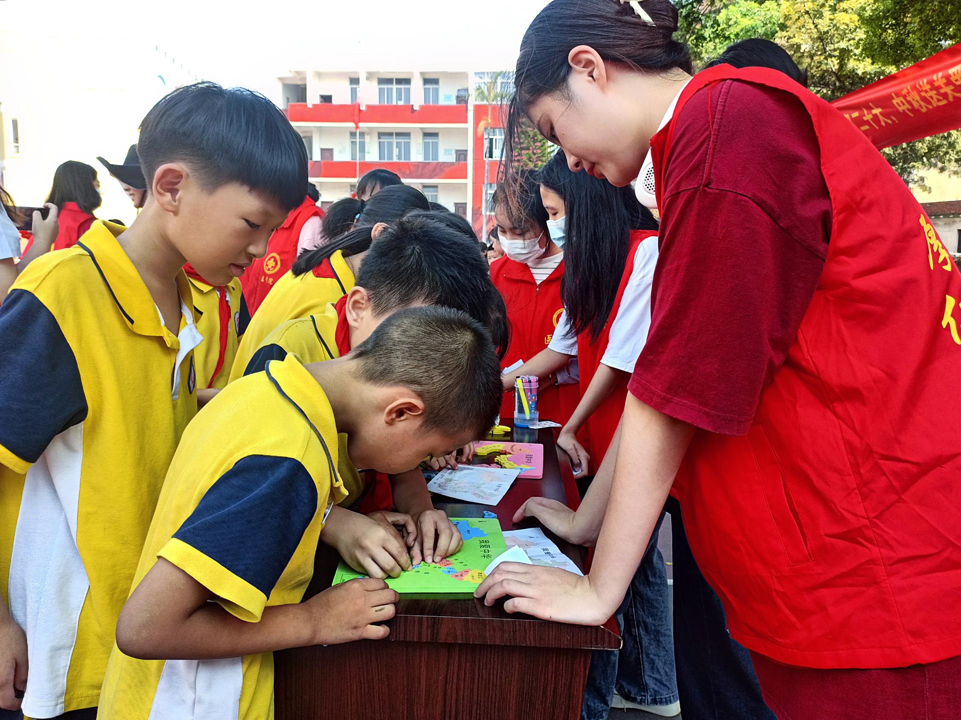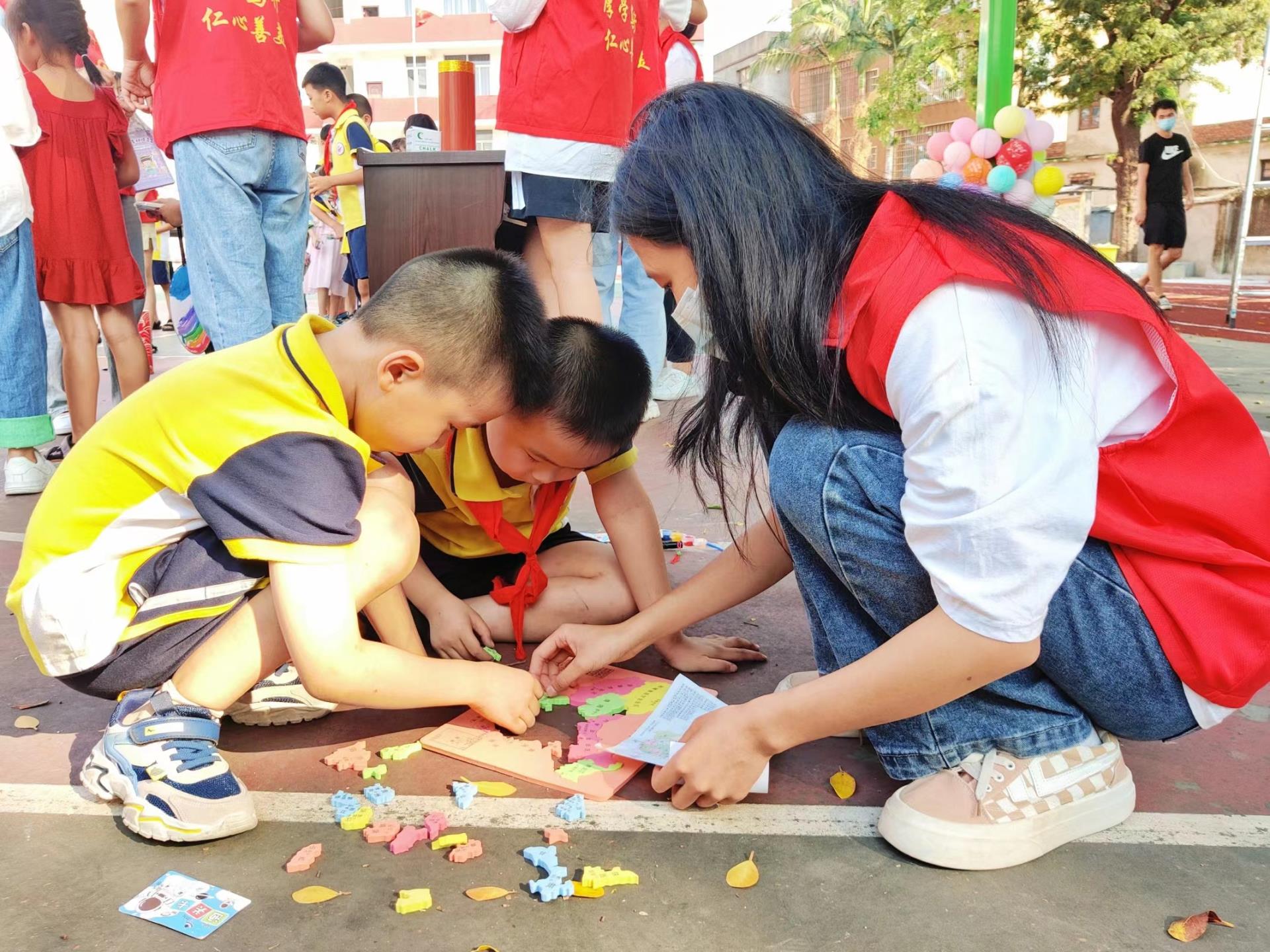 孩子们认真地观察、思考拼图的方案,快速操作着灵巧的小手,时而紧锁眉头,时而喜笑颜开。在志愿者姐姐的帮助下,小朋友们以最快的速度将散乱的图块拼成一幅美丽中国。小朋友在游戏中轻松地了解了中国行政区划,在动手拼装的过程中认识了各个省份、自治区、直辖市的分布及其轮廓。一张中国地图逐渐装进孩子们心中。
